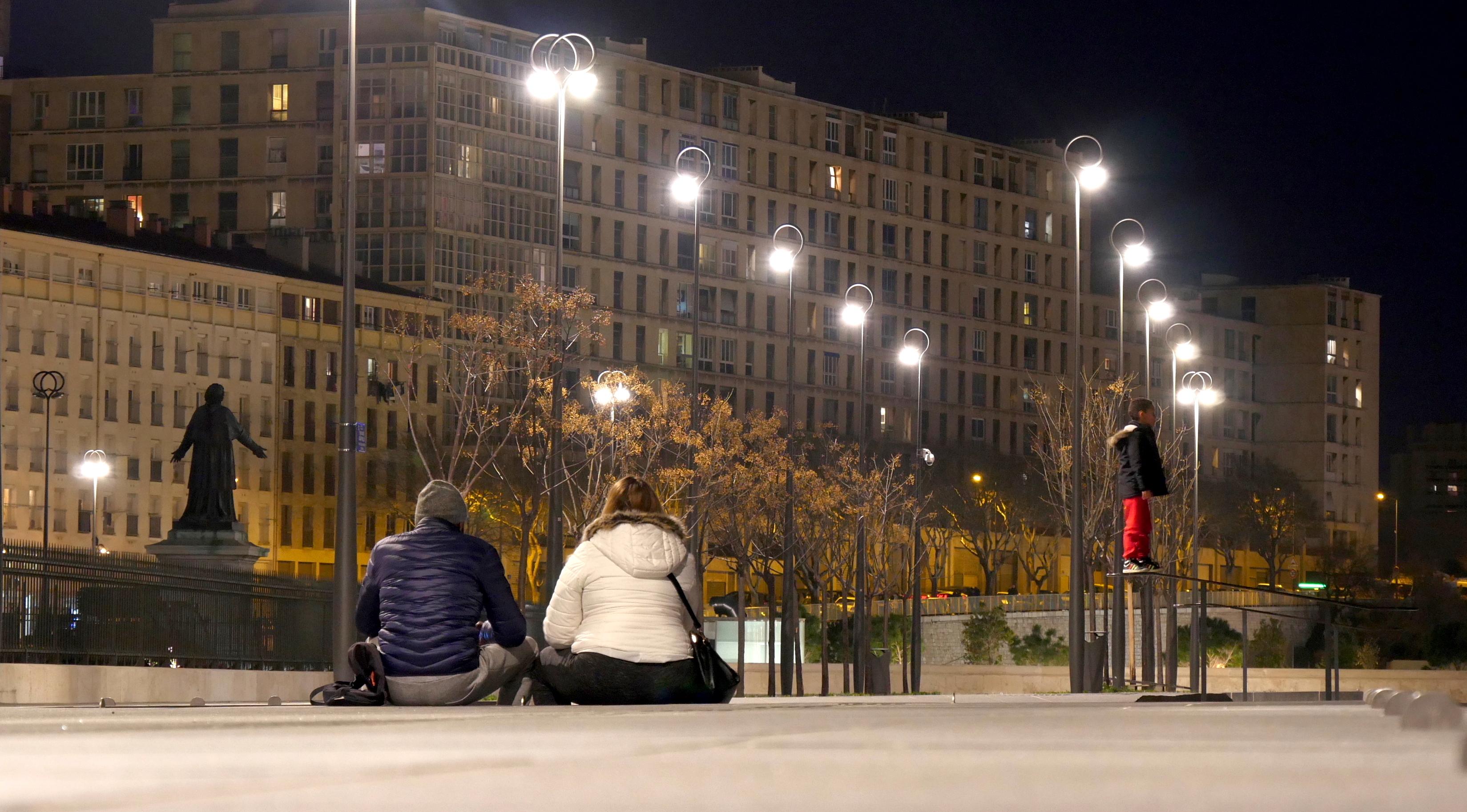 Un soir de février sur l’esplanade de la Major, il est un peu plus de 20 h, tout le monde est parti sauf ce trio. Il fait froid. Le gamin, un temps sagement assis auprès de la dame en blanc, se perche sur la balustrade de métal, tournant le dos à la statue de Monseigneur François-Xavier de Belsunce de Castelmoron, évêque de Marseille durant la peste de 1720, qui n’en revient pas.