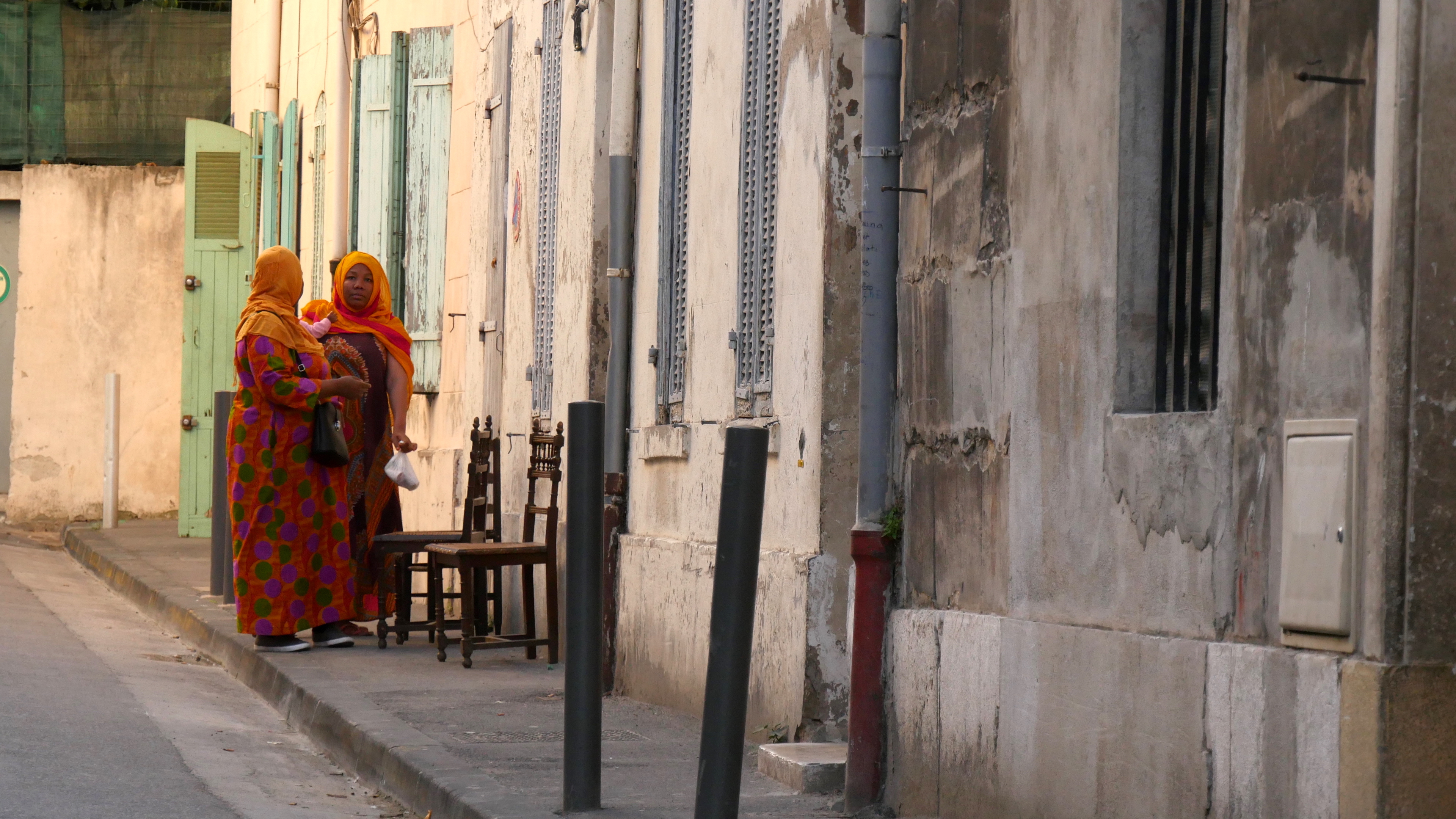 Une fin d’après-midi, séance photos dans le quartier Saint-Mauront sous l’autoroute du soleil qui entre jusqu’au cœur de Marseille : parkings, terrains de sport, friches, béton brut… Drôles d’espaces que je quitte en passant par de petites rues paisibles où je croise ces deux dames avec un bébé.