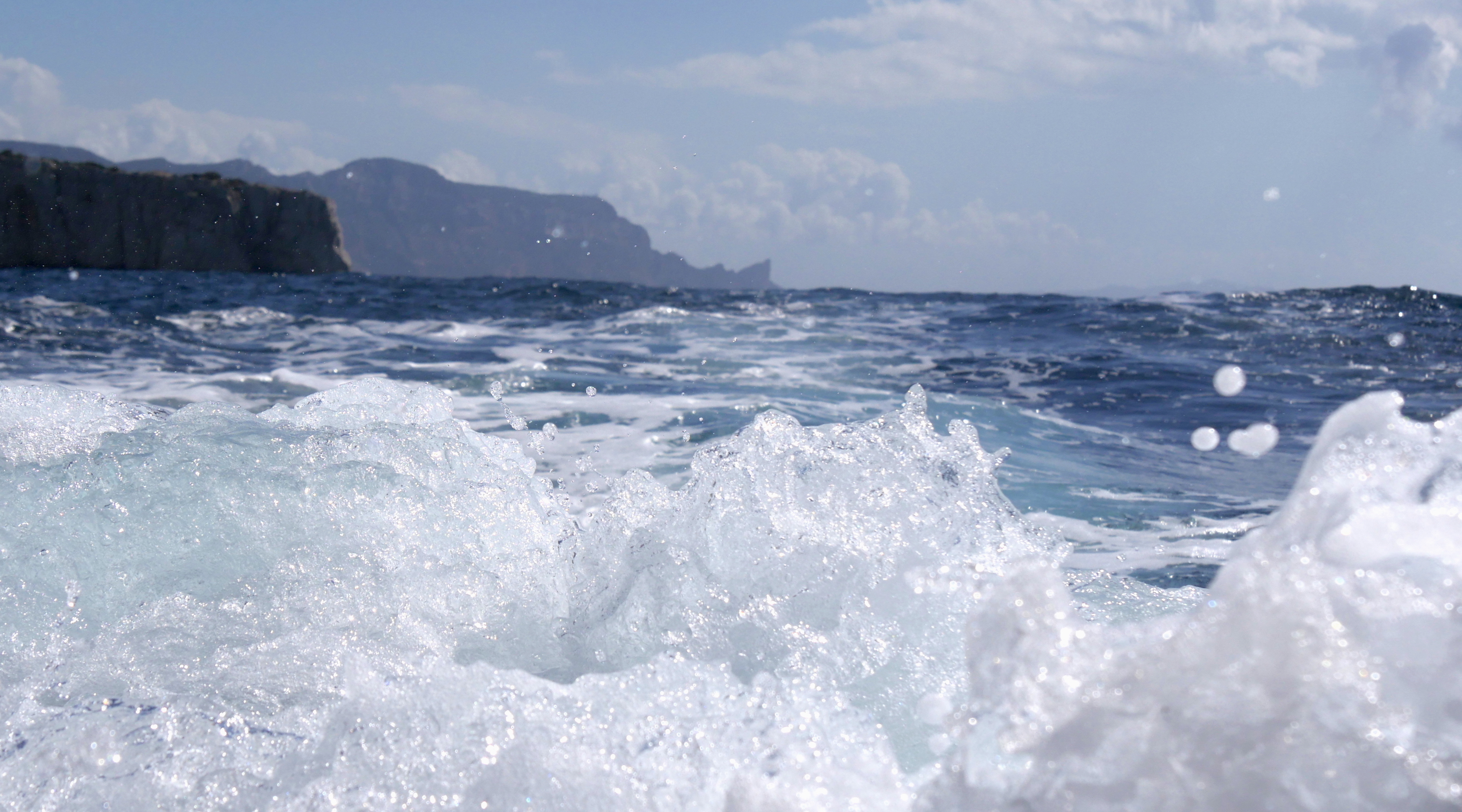 C’est un dimanche non pas au bord de l’eau mais sur l’eau pour l’anniversaire de Bruno et il fait beau. Départ des Goudes, petit tour dans les calanques, appareil au ras des flots, on vient de passer le Bec de Sourmiou (à gauche) et sur les remous les falaises du Cap Canailles et le Bec de l’Aigle.