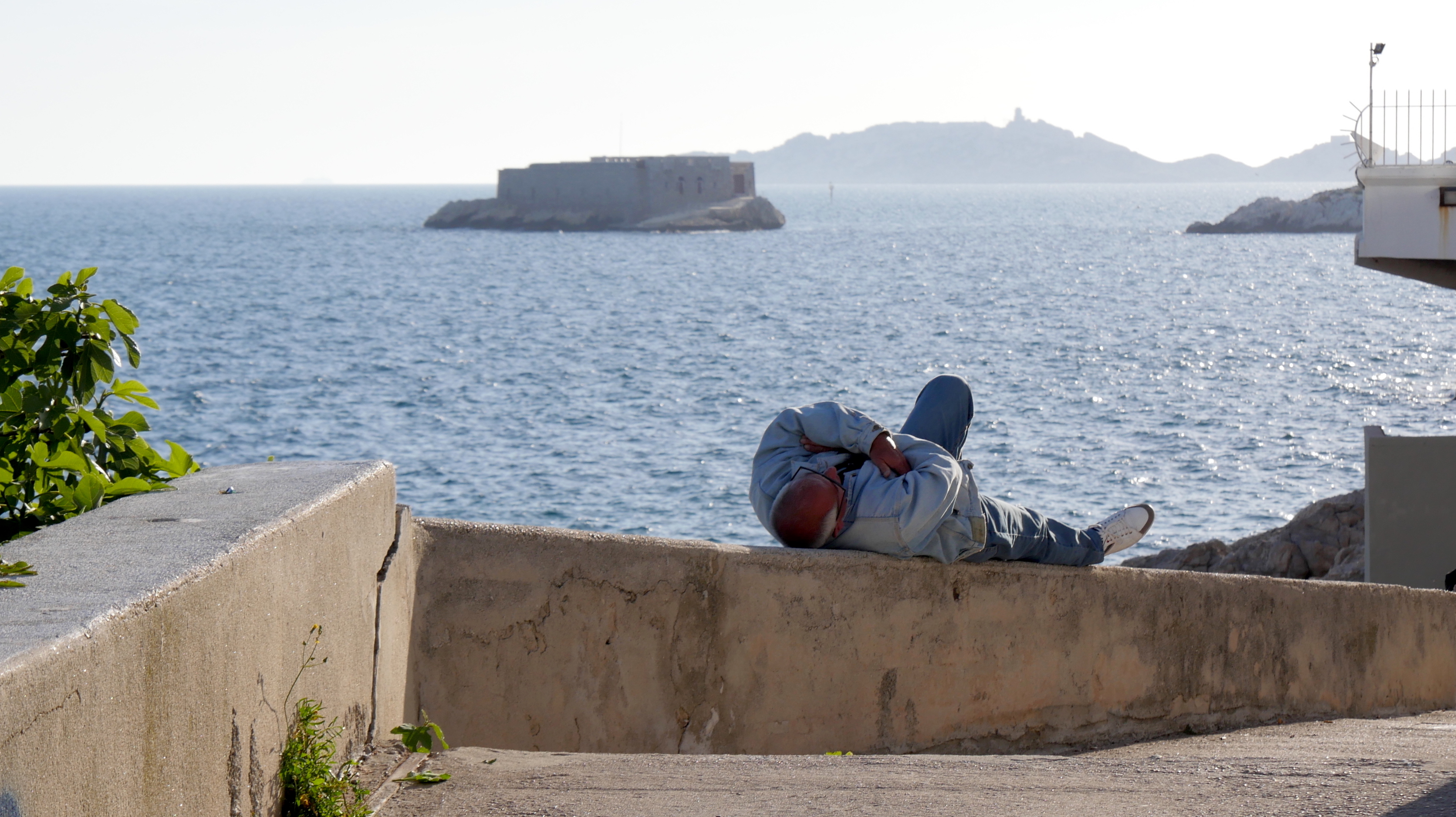 Dimanche fin d’après-midi, il fait beau. Petite promenade sous la corniche Kennedy sur le sentier qui relie les anses de Maldormé et de la Fausse Monnaie. Drôle de nom n’est-ce pas ? Pour en savoir plus : http://www.tourisme-marseille.com/fiche/anse-de-la-fausse-monnaie-marseille/ A voir cet homme, allongé à deux pas d’un célèbre restaurant étoilé marseillais, l’anse de Maldormé porte mal son nom en ce jour d’avril. A quelques encâblures, l’île Gaby et son fort carré. Au loin, le Frioul.