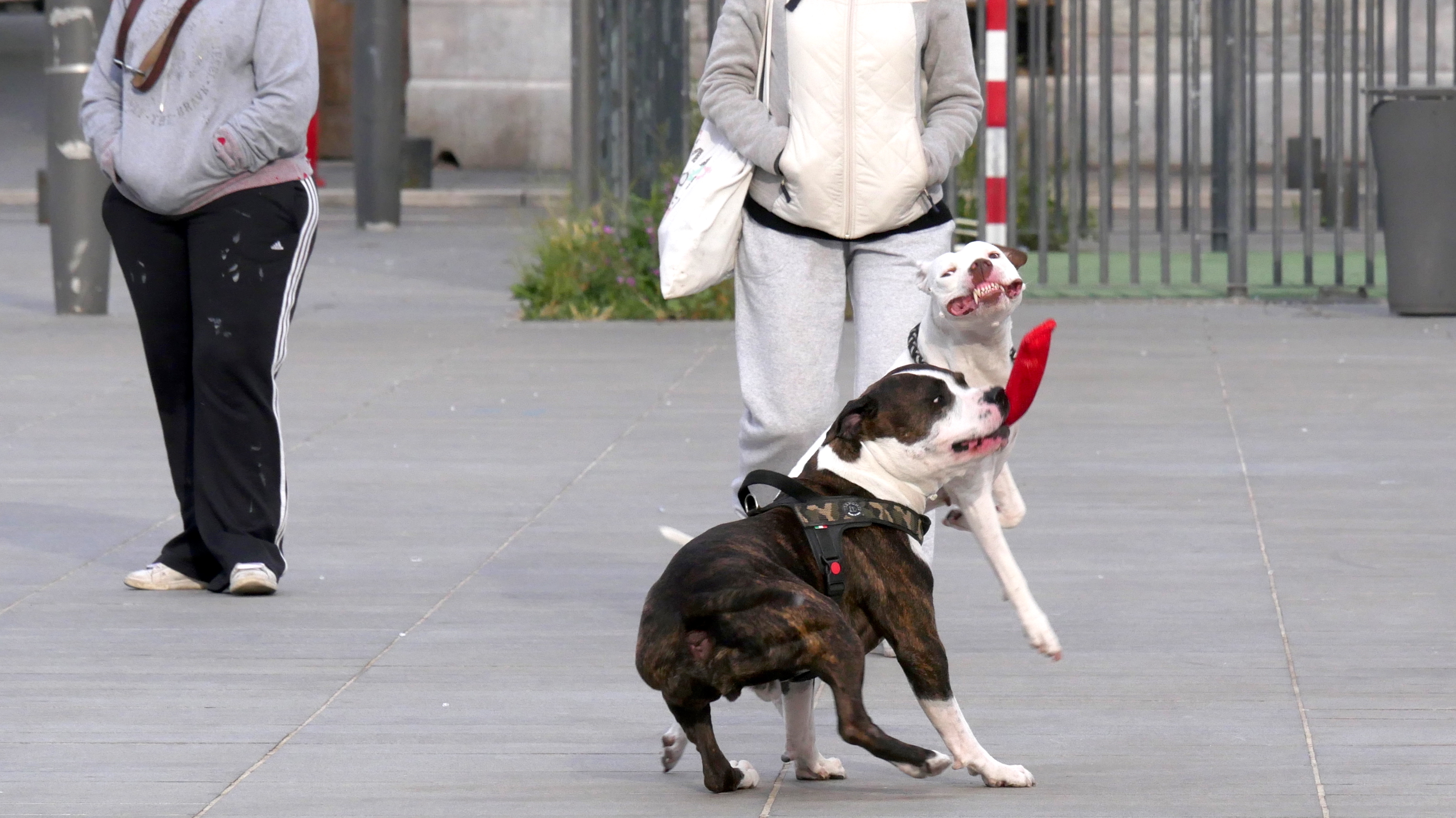 Contrairement aux apparences, ces deux adorables toutous s’amusent comme des fous avec un solide petit sac rouge qu’ils se disputent sous les yeux attendris de leurs maîtresses. Quand je passe à proximité des molosses, après avoir fait cette photo, ils s’immobilisent d’un coup et me suivent du regard. Je n’ai pas traîné.