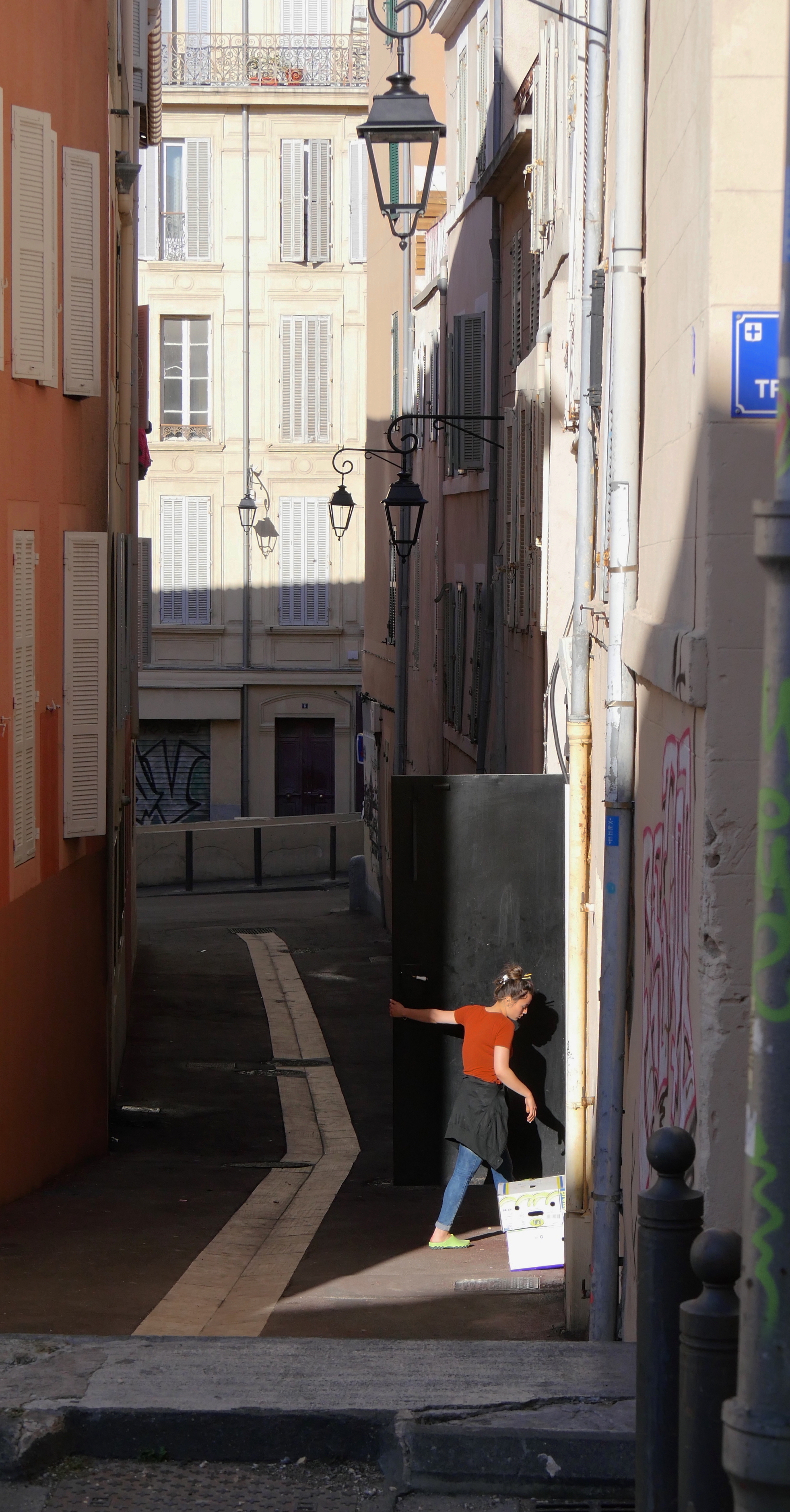 Séance photos avec mes compères dans le Panier. On fait des images sur une placette derrière la Vieille Charité. Pas grand-monde en cette fin d’après-midi sinon cette jeune femme pressée qui fait un aller-retour dans un entrepôt et dans un rayon de soleil.