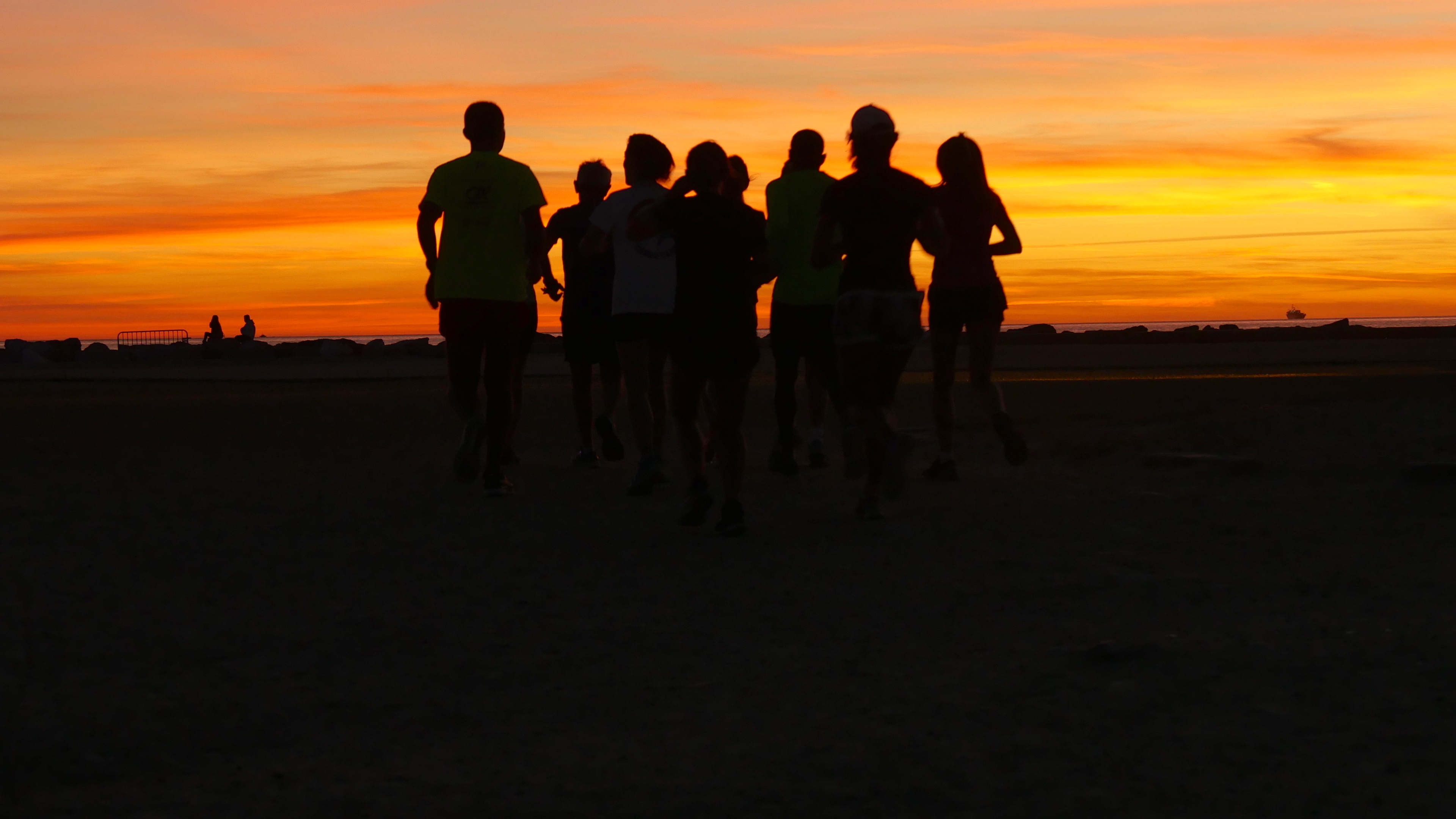 C’est juste après avoir photographié les pêcheurs assis sur leurs pliants. Le soleil est parti se coucher il y a quelques minutes, je marche le long de l’Huveaune en direction du parking quand arrive une petite troupe de joggers. Bien groupés, ils discutent en trottinant. Je les laisse passer et je me retourne pour faire la photo sur fond de ciel lumineux.