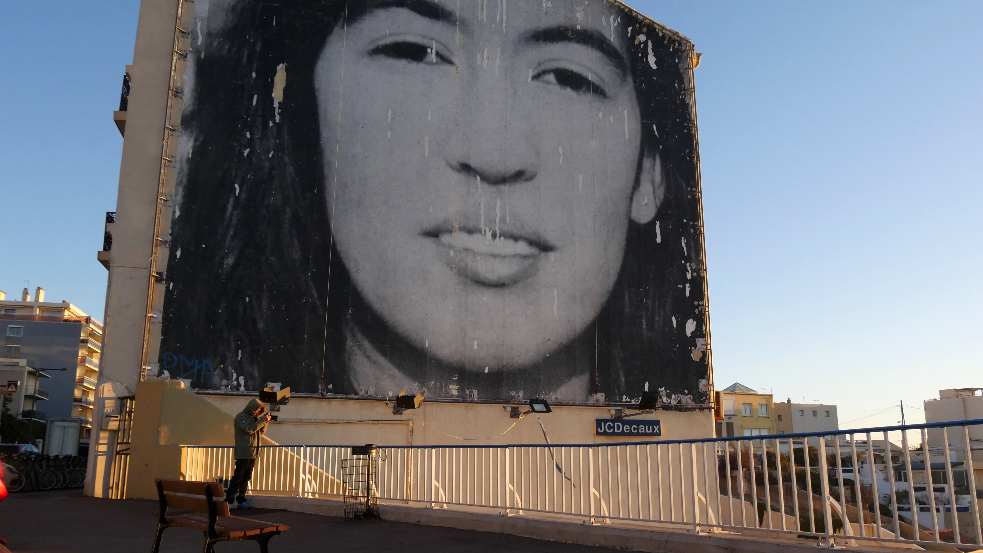 C’est l’immeuble sur la Corniche, là où est longtemps resté affiché le visage de Zidane. Aujourd’hui c’est celui d’une jeune femme. Dessous, un photographe à capuche photographiait la mer démontée (encore et toujours le mistral !), il m’a dit qu’il ignorait qui elle était mais que c’était une œuvre de JR. Le vent, la mer, les embruns font leur travail de sape sur l’image et c’est superbe, de près comme de loin. JR est plus sympathique qu’il en a l’air. Je l’ai découvert sur cette page qui héberge une vidéo très instructive : http://www.jr-art.net/fr/jr