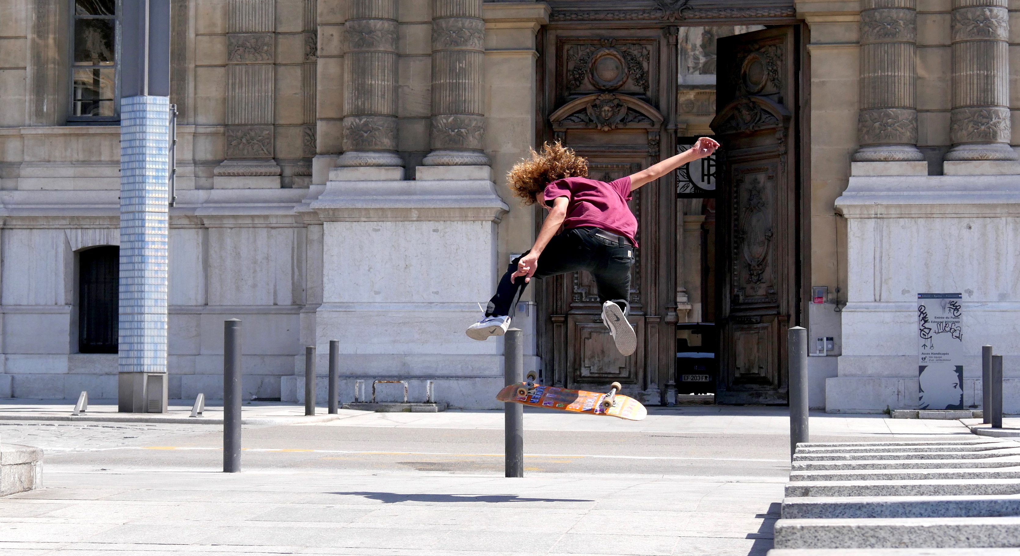 Devant la préfecture, ce jeune garçon tente la même figure qu’il ne parvient pas à exécuter. Il essaye encore et encore, en vain. Sa colère monte et, à chaque échec, le chapelet de jurons s’allonge. Il finit par abandonner et quitter la place, sa planche sous le bras, peuchère…