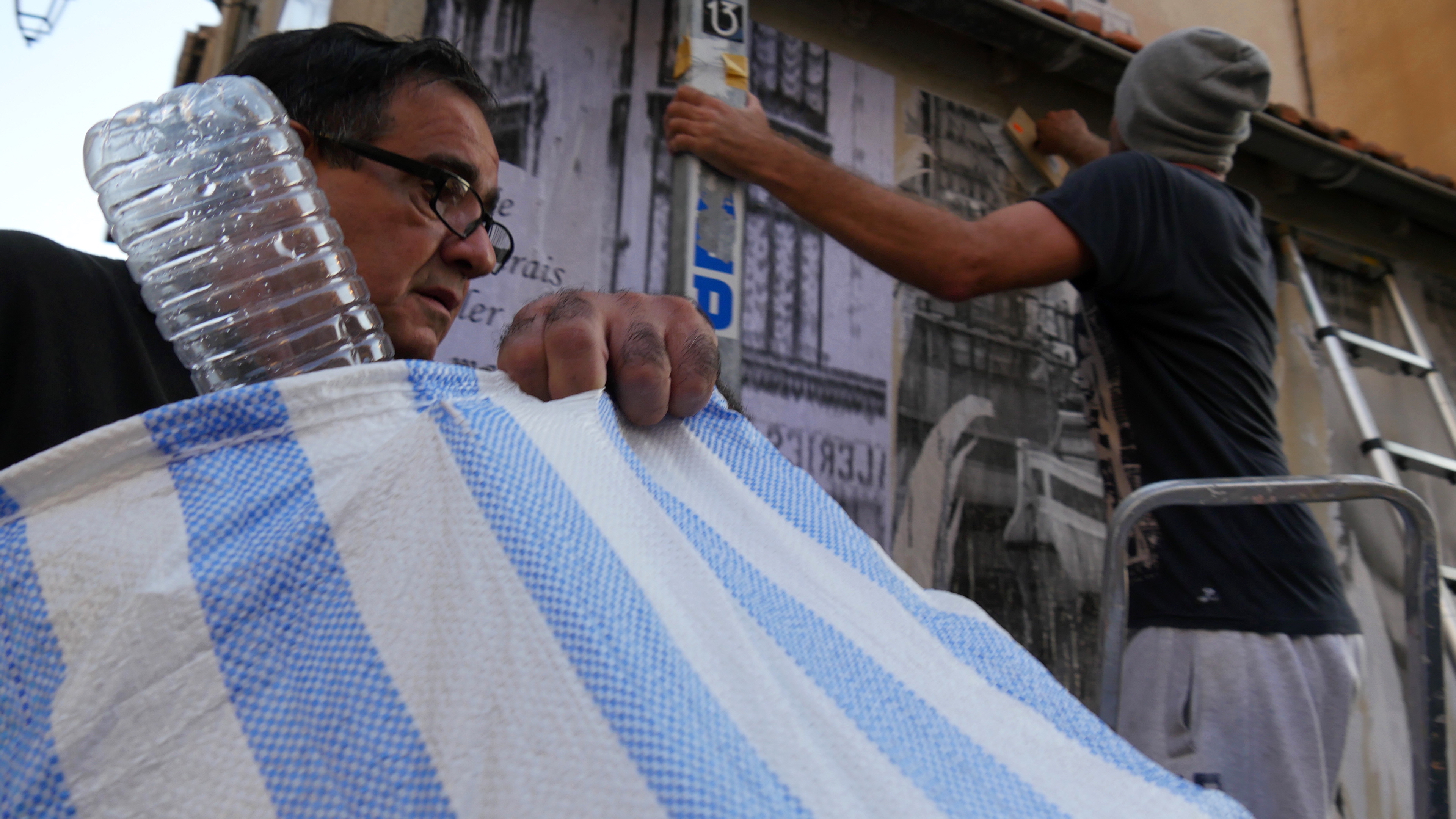 Je viens de demander à l’homme au bonnet avec quelle image il va recouvrir l’affiche qu’il enduit de colle. « Ah, ah, vous aurez la surprise », dit-il, avec un grand sourire avant de reprendre sa tâche. C’est alors que le monsieur à lunettes passe avec son gros sac poubelle bleu et blanc.