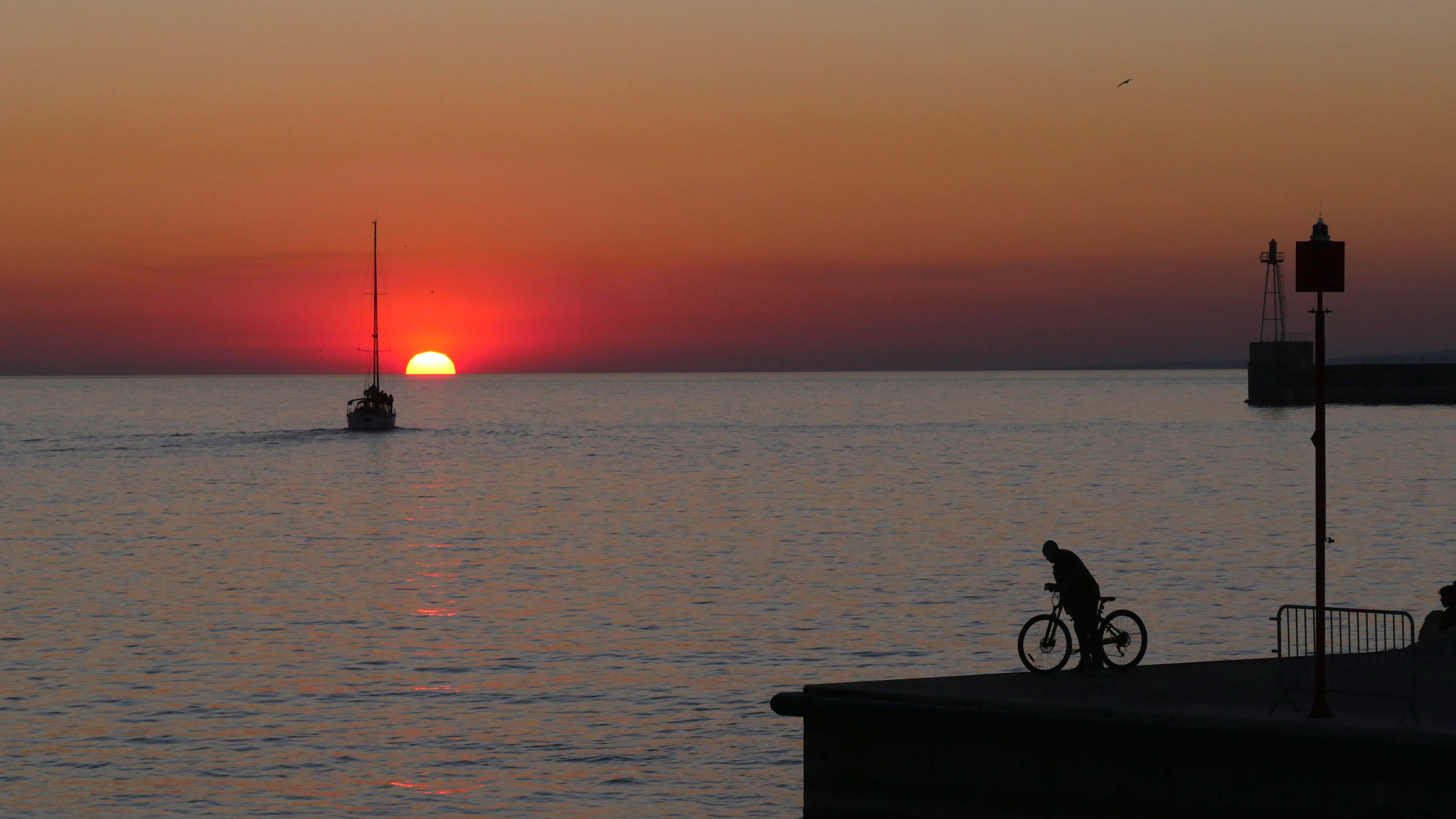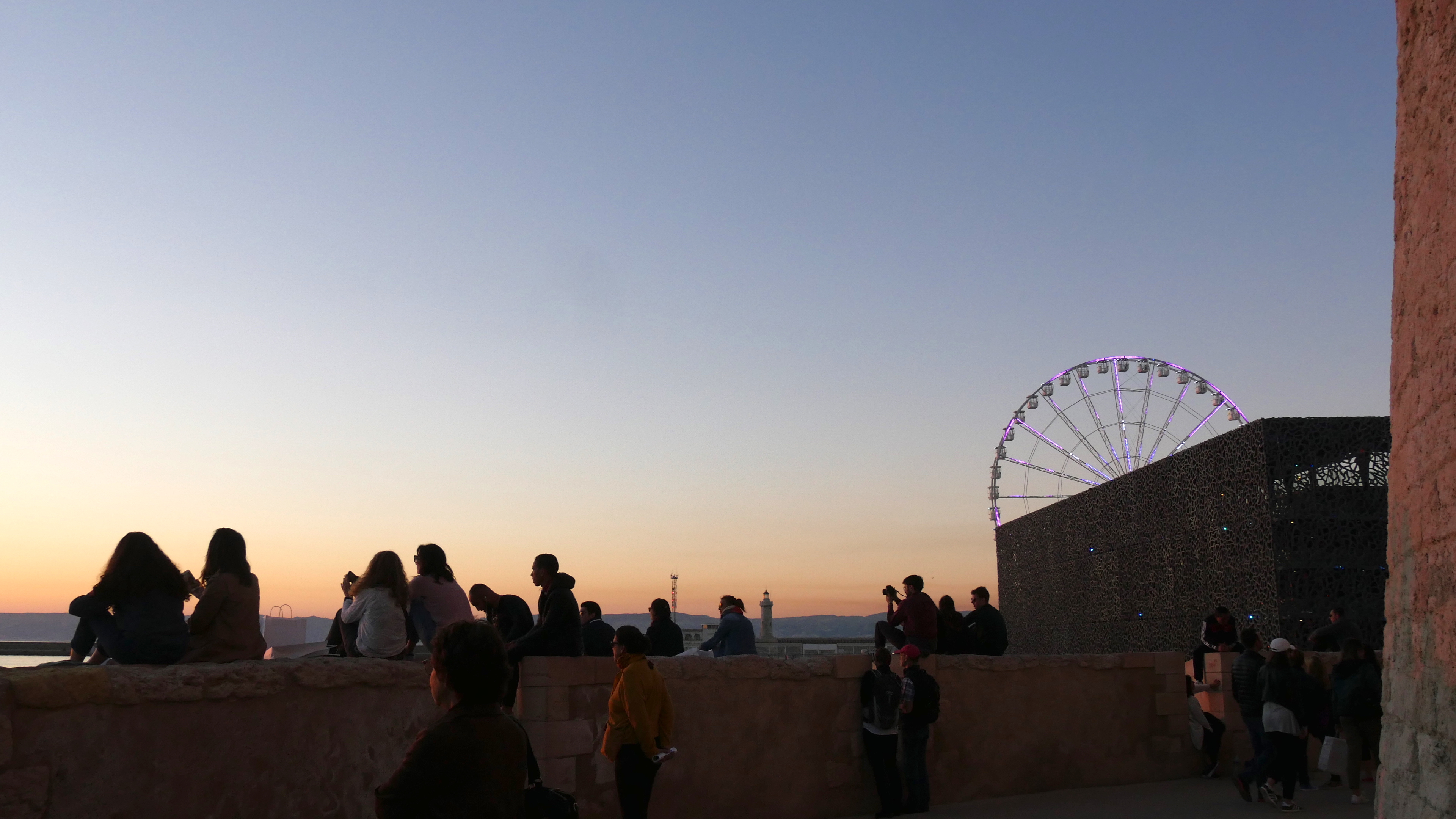 Samedi soir, petite virée sur la promenade Louis Brauquier au pied du Fort Saint-Jean à l’heure du coucher de soleil. Surprise ! II y a beaucoup de jeunes (photo 2) venus admirer le spectacle et ça fait vraiment plaisir. Quand le cycliste, sans doute payé par le Syndicat d’Initiative, vient se poser au bord de la jetée, je ne résiste pas, je fais une photo. Comme tout le monde.