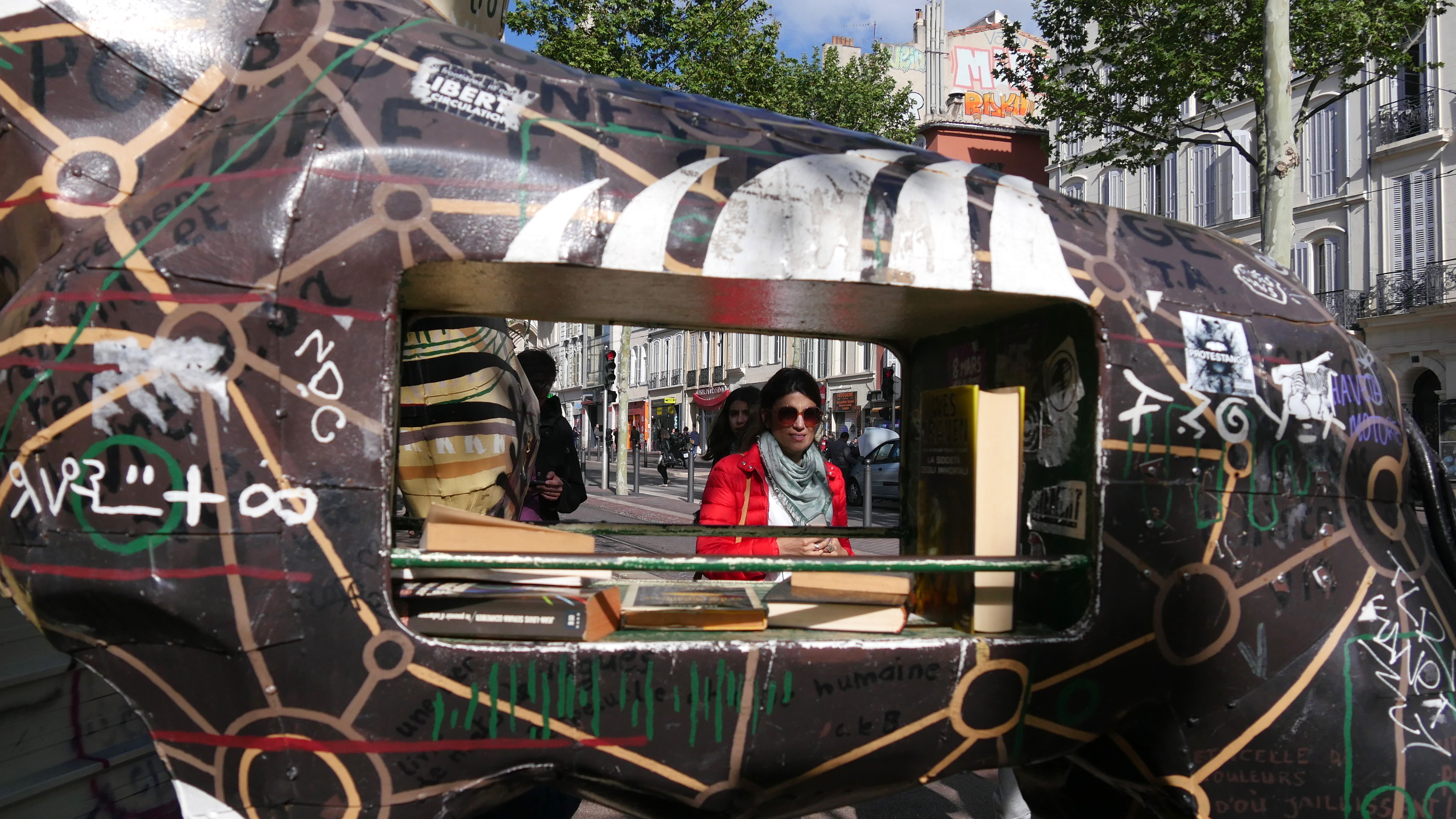 Zarafa*, une girafe de 6 mètres de haut, n’est plus là du fait des travaux du cinéma à proximité. Reste, le long des rails du tram, son girafon, Marcel Zarafon pour les intimes : une borne de livres échange pour celles et ceux qui préfèrent partager leurs bouquins plutôt que les jeter. Sympathique et convivial.