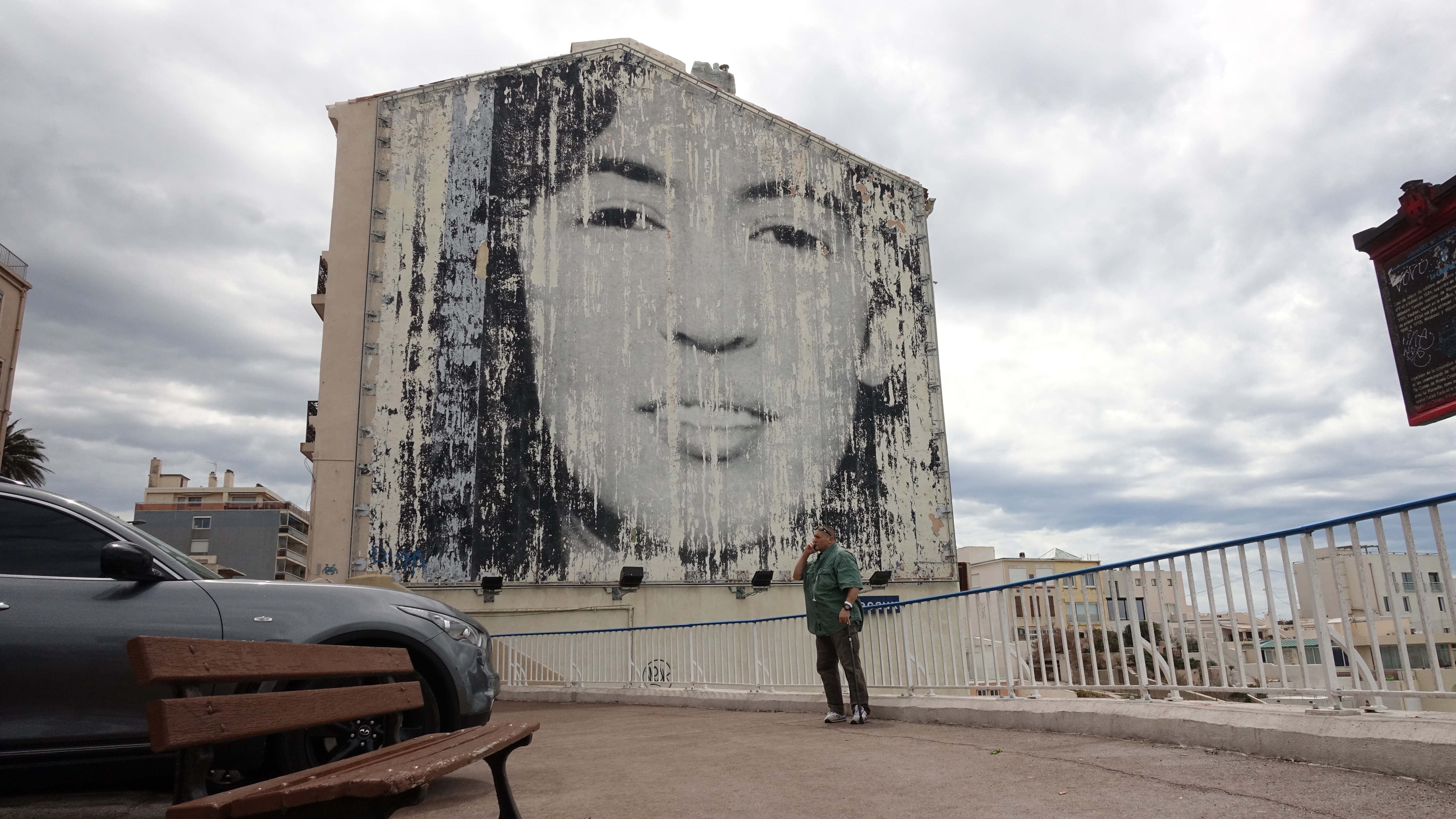 Ou les ravages du temps. Cet immense portrait d’une jeune femme anonyme a pris la suite de Zidane et de diverses publicités. La photo, choisie par JR, a souffert des intempéries. A mon goût, c’est très beau sous le ciel plombé d’un samedi de printemps.