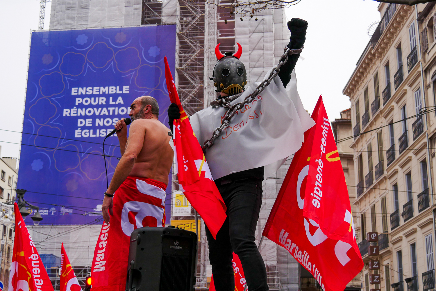 Manifestation du 17 décembre. Rassemblement CGT en haut de la Canebière. L’orateur et son comparse, juchés sur le toit d’une camionnette, chauffent l’assistance avant le départ du cortège, au pied de l’église Saint-Vincent de Paul, plus connue à Marseille sous le nom d’église des Réformés. Grosse ambiance.