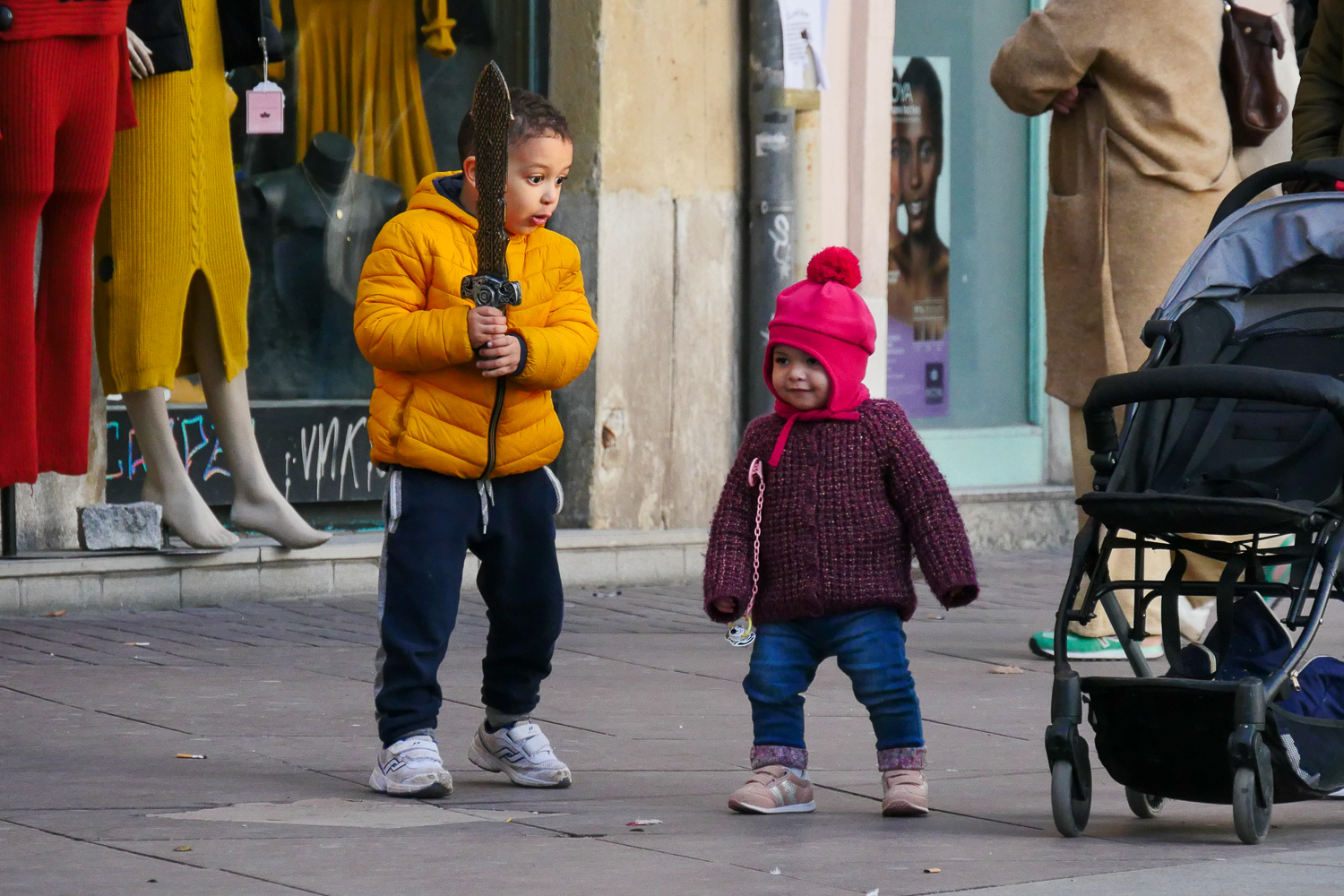 Depuis un moment, je les regarde arriver avec leur mère sur le cours. Le jeune gilet jaune combat contre des ennemis invisibles et nombreux parmi les passants tandis que le bonnet rose vient juste de descendre de la poussette. Avec un plaisir certain.