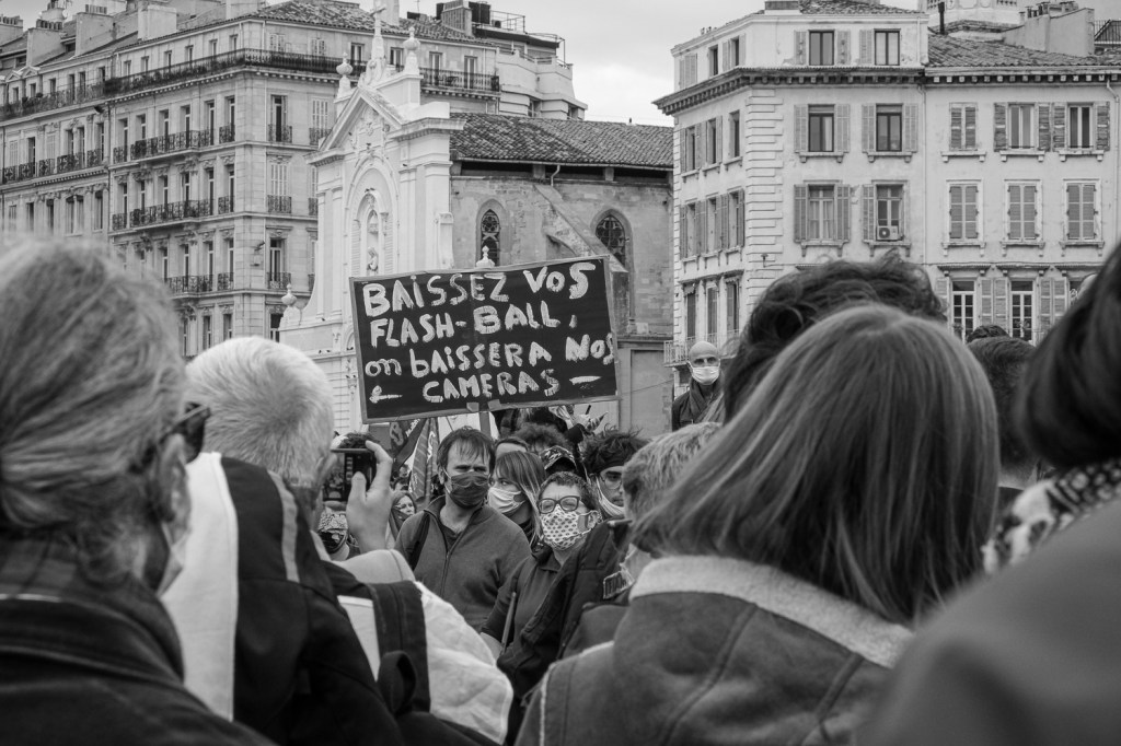Samedi 28 novembre 2020, manifestation au départ du Vieux Port contre la loi dite « Sécurité globale ». Pas mal de monde, une batucada, une fanfare et des gens motivés, motivés, il faut rester motivé, comme dit Zebda dans sa célèbre version du Chant des Partisans.