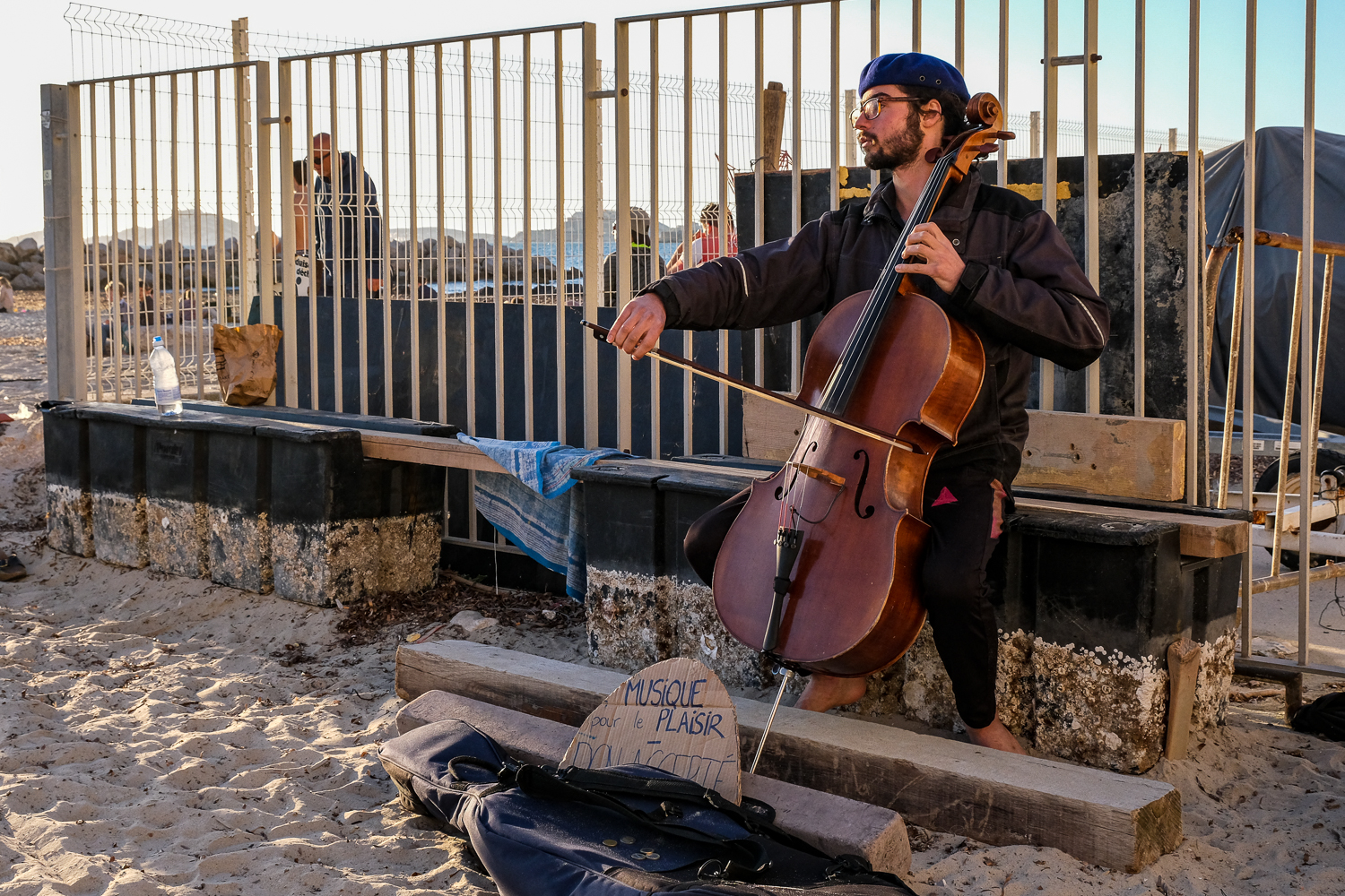 Du haut de la corniche je vois la plage en contrebas. Du monde partout, ça joue au beach volley, des gens assis assis prennent le soleil, des gamins font des châteaux de sable. On se croirait au printemps. Je descends par les escaliers : me voici à l’entrée de la plage. Une bien belle journée.