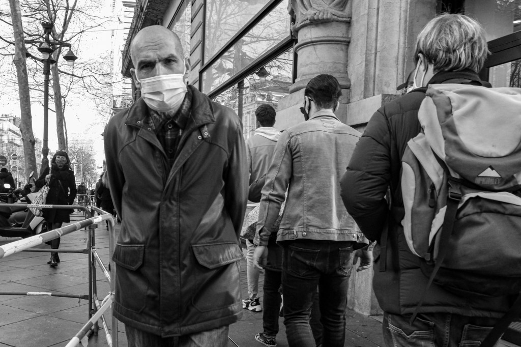 Canebière Je sors du tram. Une barrière de chantier posée le long de la rame m’oblige à faire un écart. Je me retrouve nez à nez avec ce monsieur. On se regarde, on se croise, on s’en va. Partager : Partager sur Facebook(ouvre dans une nouvelle fenêtre) Facebook Partager sur X(ouvre dans une nouvelle fenêtre) X Partager sur WhatsApp(ouvre dans une nouvelle fenêtre) WhatsApp Partager sur LinkedIn(ouvre dans une nouvelle fenêtre) LinkedIn Partager sur Telegram(ouvre dans une nouvelle fenêtre) Telegram Envoyer un lien par e-mail à un ami(ouvre dans une nouvelle fenêtre) E-mail Plus Imprimer(ouvre dans une nouvelle fenêtre) Imprimer J’aime chargement… Articles similaires 8 mars 20214 mars 2021 by alaingirard Categories: gens, MassiliaTags: hiver, hommes, masque, noir e, noir et blanc Laisser un commentaire