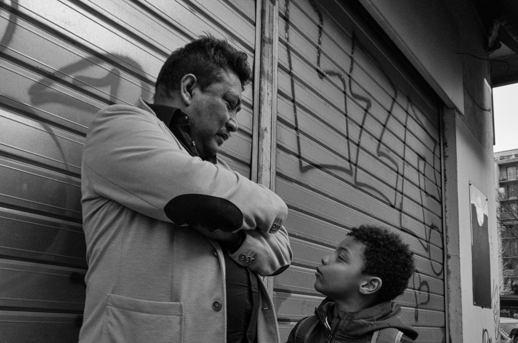 J’ai un doute sur la localisation, mais si ce n’est pas ce boulevard, ce n’est pas bien loin. Sur le trottoir qui monte fort (ça j’en suis certain !), père et fils (c’est probable) sont trop occupés par leur discussion pour me jeter un regard ou lever la tête à mon passage. Des conditions idéales pour un voleur de photos…