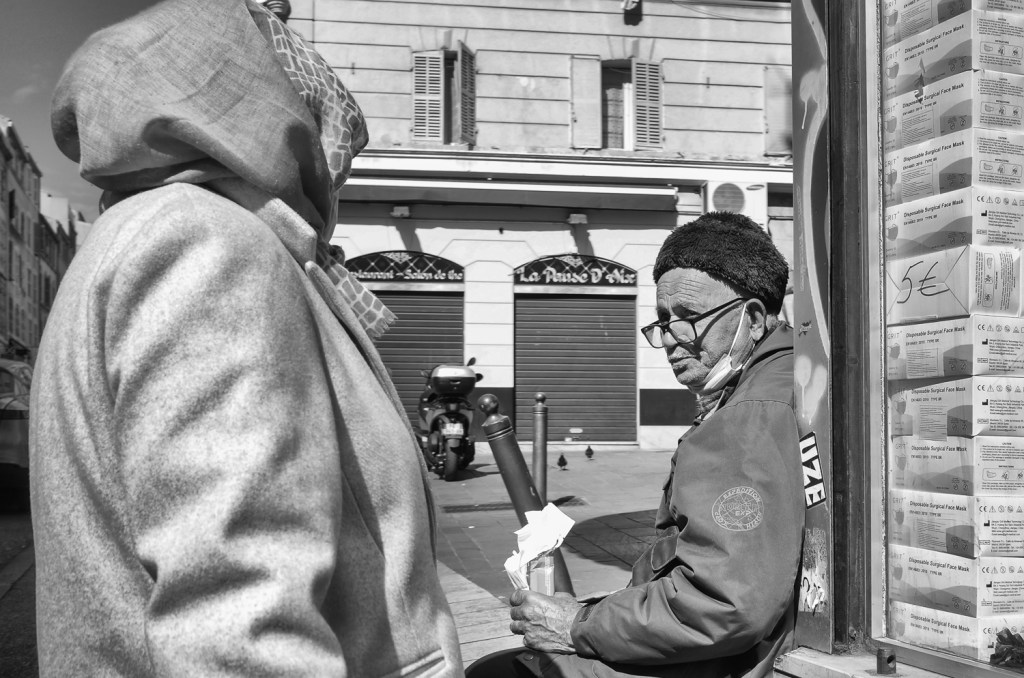 En sortant de l’Alcazar, je remonte la rue en direction de la Porte d’Aix. Grand soleil et beaucoup de monde sur le trottoir malgré les apparences. Je peux avancer, tranquille, appareil photo à la main parmi les badauds qui se croisent. Quand je vois ce chibani discuter avec une dame, je m’approche vraiment très près.