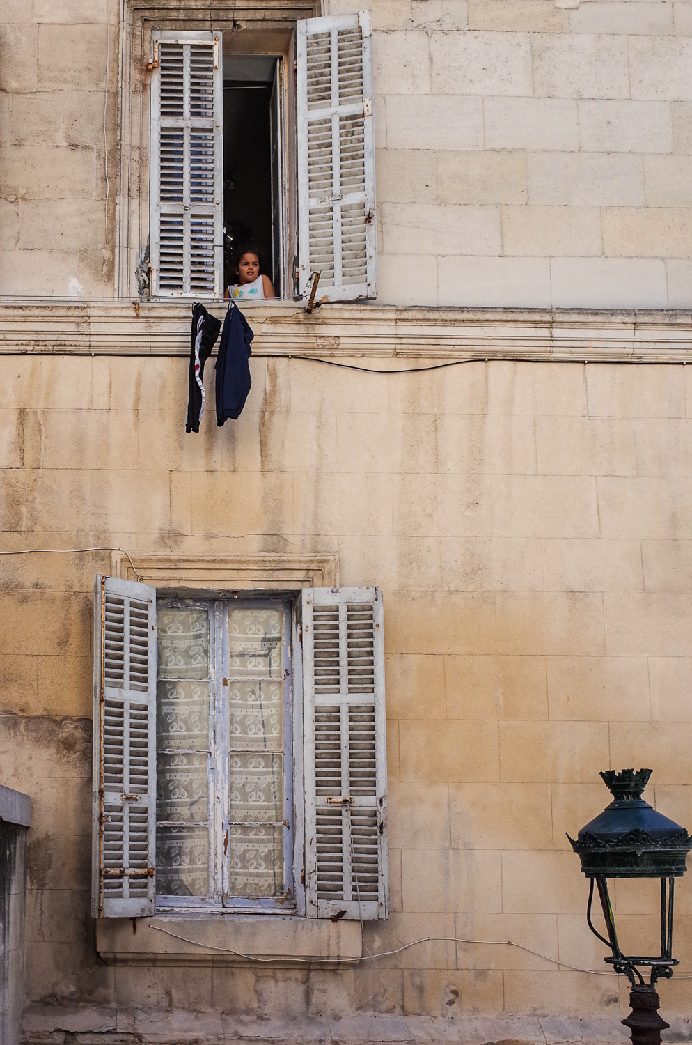 En montant les marches vers la place des 13 coins qui héberge un bar du même nom, rendu célèbre par Jean-claude Izzo dans sa trilogie de polars (Total Khéops, Chourmo et Solea), je découvre cette gamine à la fenêtre de l’immeuble surplombant l’escalier. Elle semble un peu tristounette.