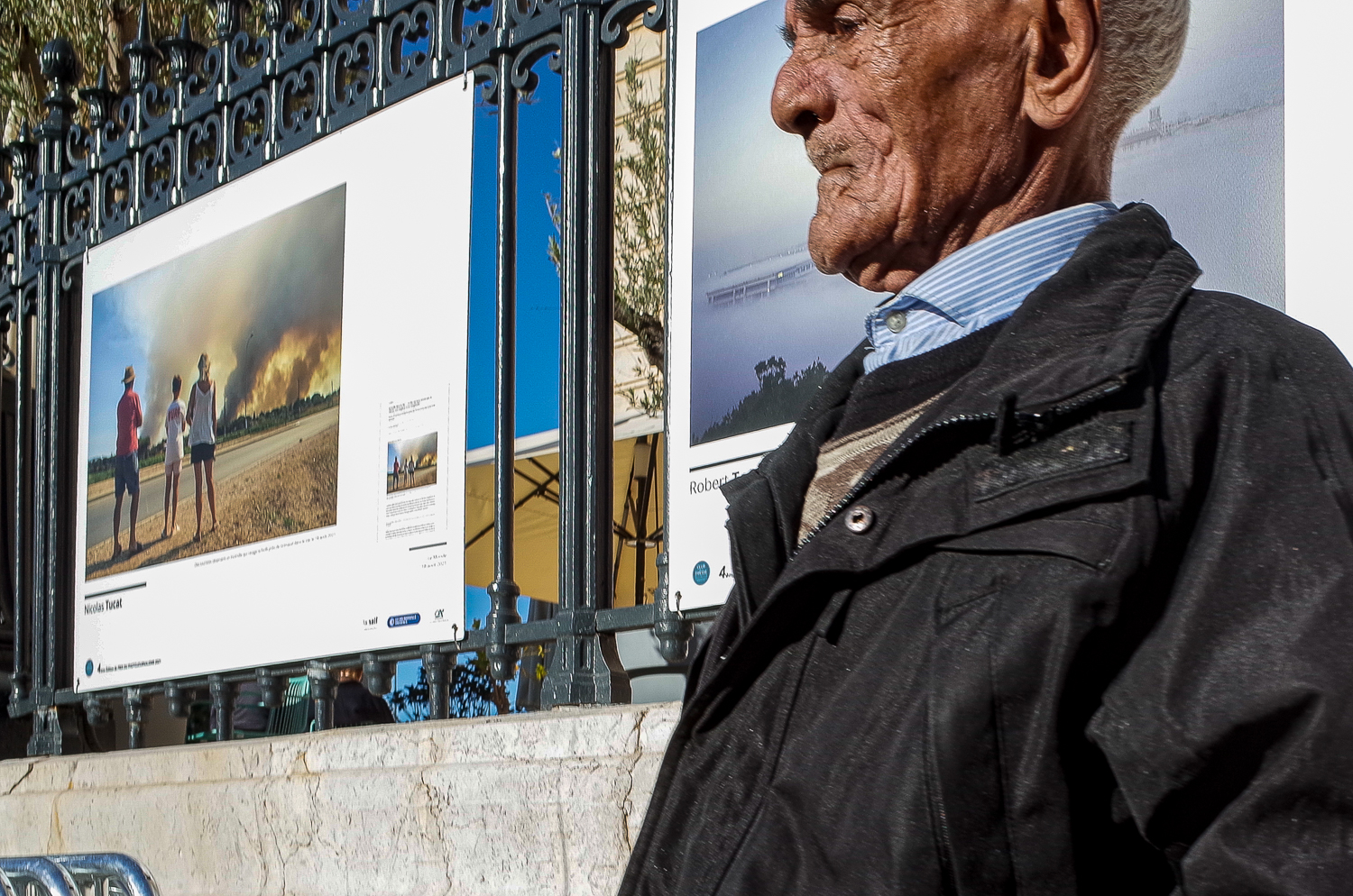 Exposition photo sur les grilles de la CCI en bas de la Canebière. Je longe les barreaux, à la découverte de belles images, avant de tomber sur ce vieux monsieur au profil aquilin. Je l’ai un peu scalpé involontairement, mais je n’ai qu’une seule photo de lui.