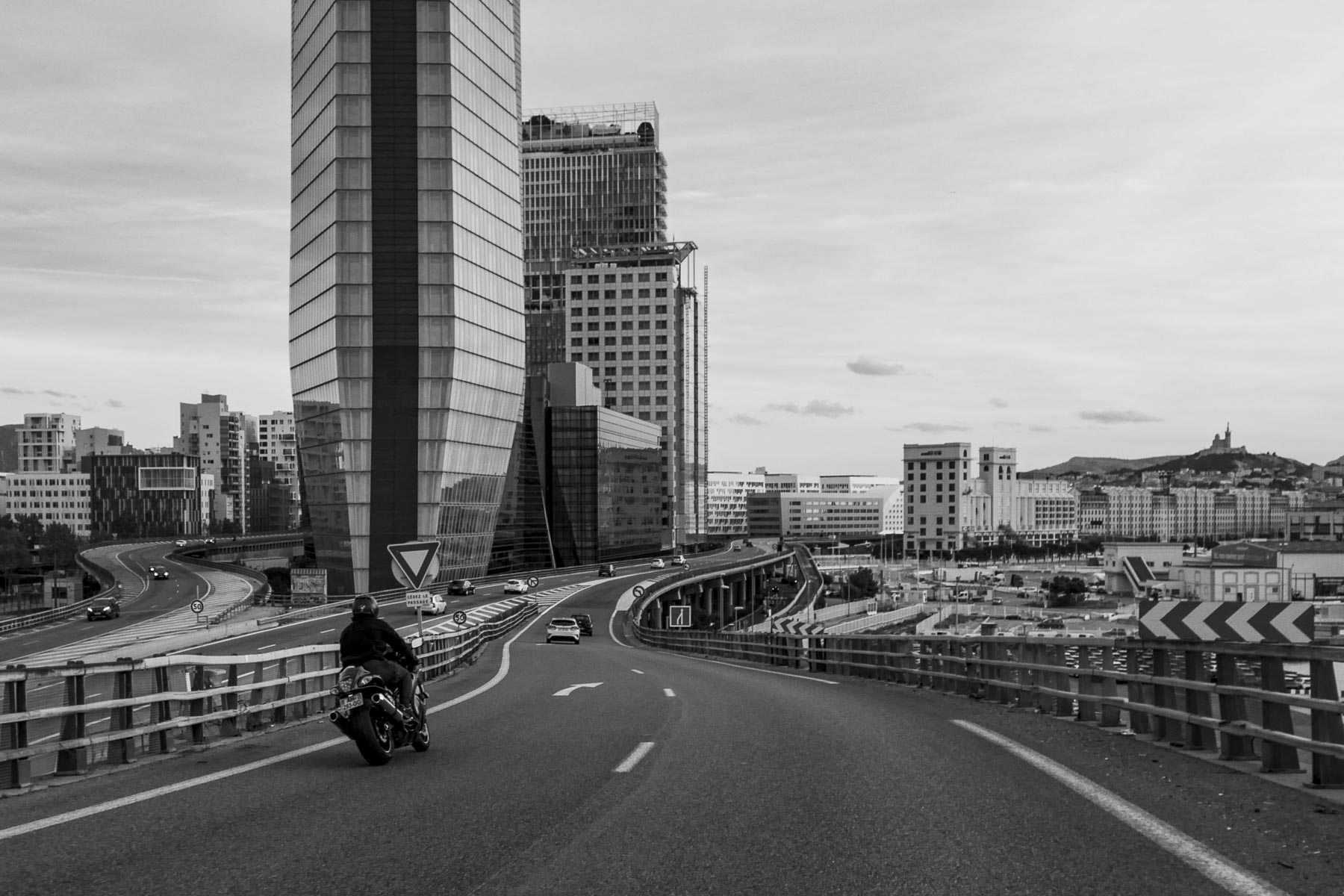 Cette arrivée sur les tours CMA-CGM et La Marseillaise m’impressionne toujours autant. Appareil photo à la portière au-dessus du rétroviseur, je me fais gronder par une motarde qui me fait signe de ne pas photographier son collègue au premier plan. Trop tard.