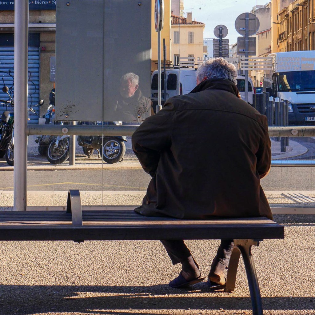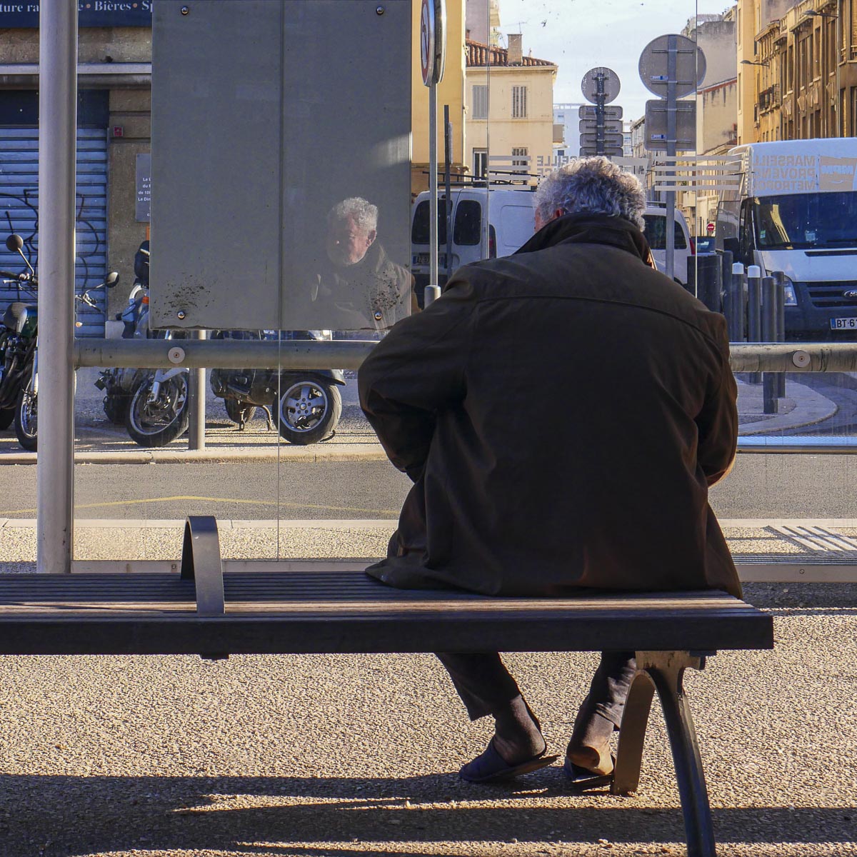 Au croisement avenue Maréchal Foch boulevard Françoise Duparc, une rue déserte, un arrêt de bus vide et un banc légèrement en retrait de la circulation. Ce jour tout est calme, je vois d’abord les chaussons du monsieur avant de découvrir le reflet de son visage dans la vitre de l’arrêt de bus.