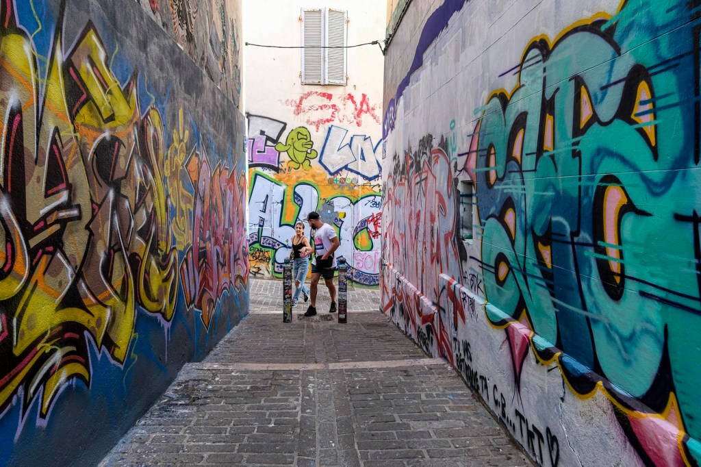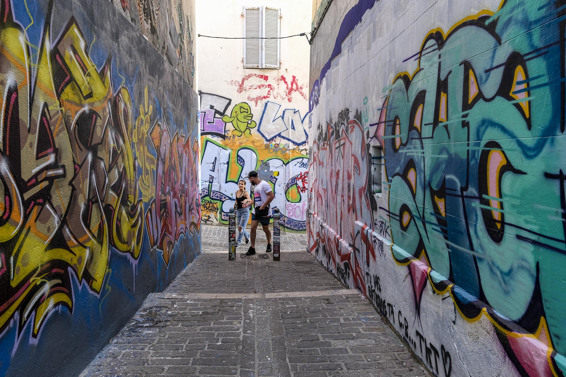 Fin de journée. Posté au milieu de la ruelle (dont j’ai oublié le nom, désolé), j’attends quelques minutes une présence humaine pour donner l’échelle des œuvres sur les murs. Photo prise, je reste immobile. Quand le couple passe près de moi, le type me regarde vaguement interrogatif (genre « vous m’avez pris en photo ? »), sa compagne est souriante.