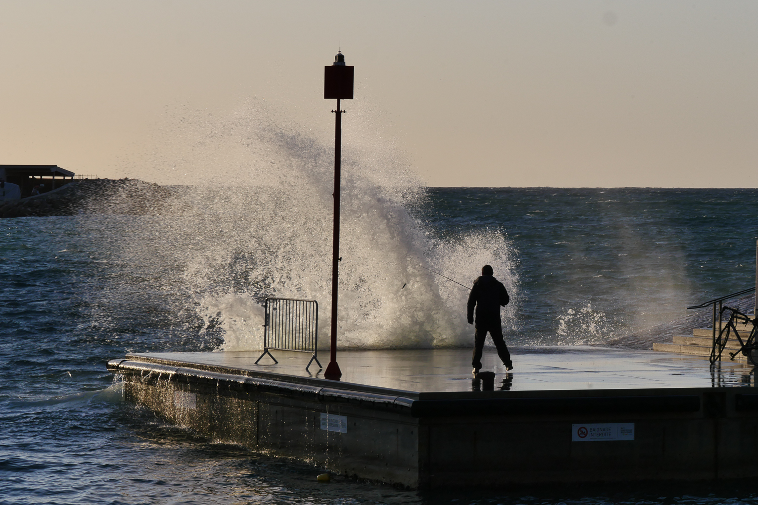 Sur le quai, près du Mucem, j’attends le vague, de loin. Le pêcheur aussi, de près. Pour l’éviter…