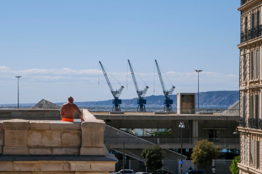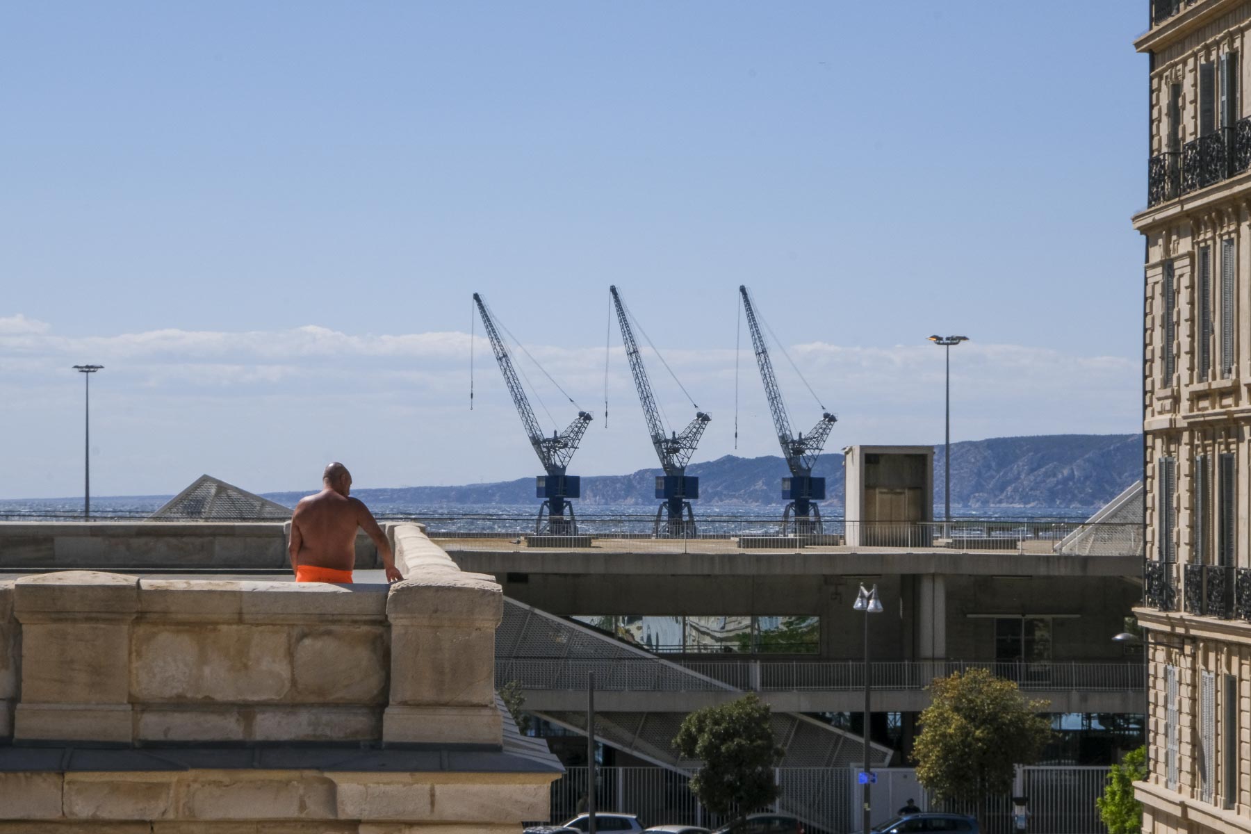 Seul devant la Major, appuyé au parapet, torse nu, bras croisés, vêtu d’un bermuda sombre, il me regarde arriver l’appareil photo à la main. Il est spectaculaire, mais comment le photographier discrètement dans cet espace vide ? je continue mon chemin et, quand je me retourne, il est en train d’ôter son bermuda, dévoilant un boxer de bain orange. Je quitte la place peu après sans savoir s’il est allé plus loin dans son streap-tease.