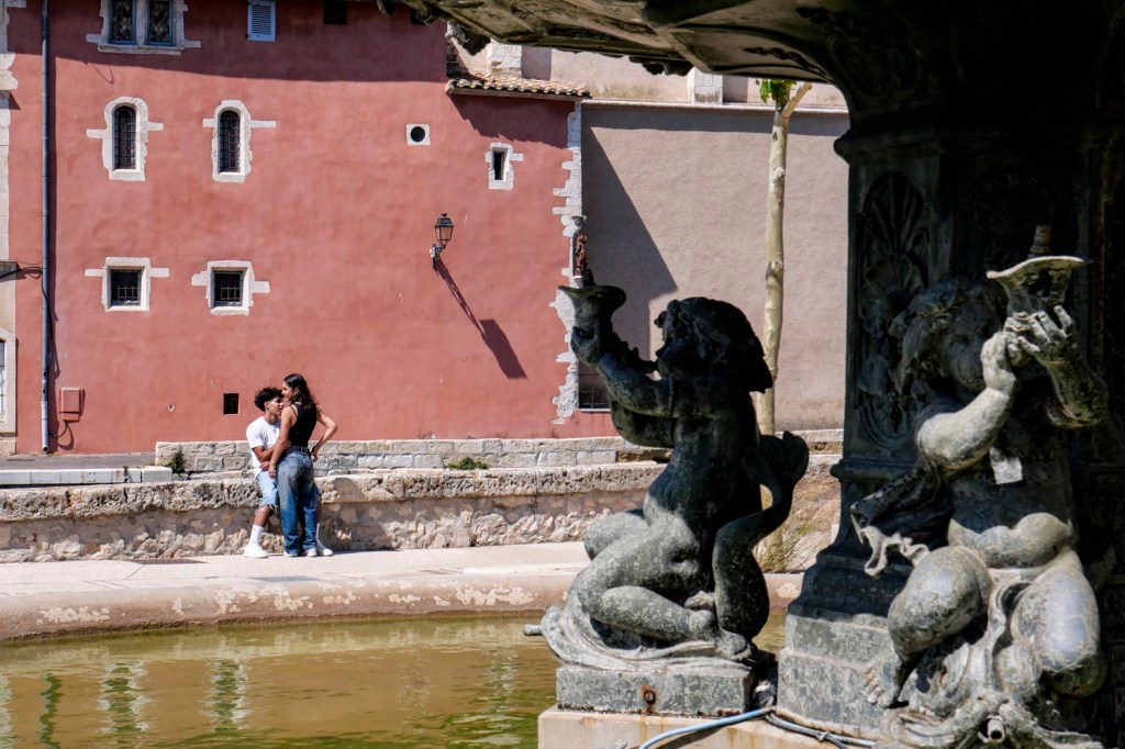 Promenade du 14 juillet dans les rues ensoleillées de la Venise provençale. Une fontaine, un petit canal et un parapet de pierre : tout le monde est à la plage, les amoureux sont seuls au monde.