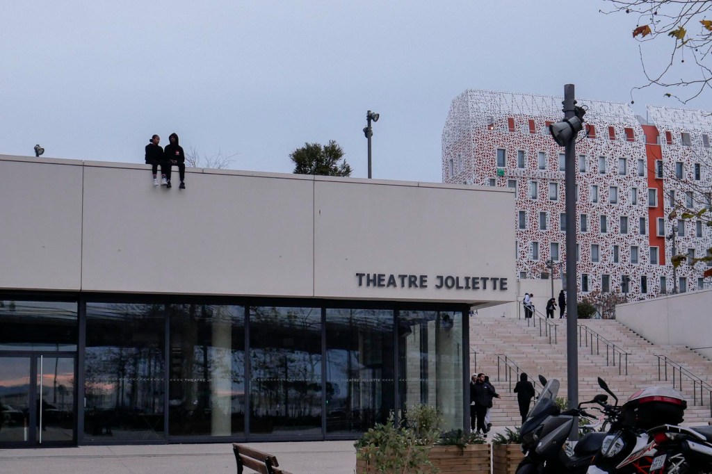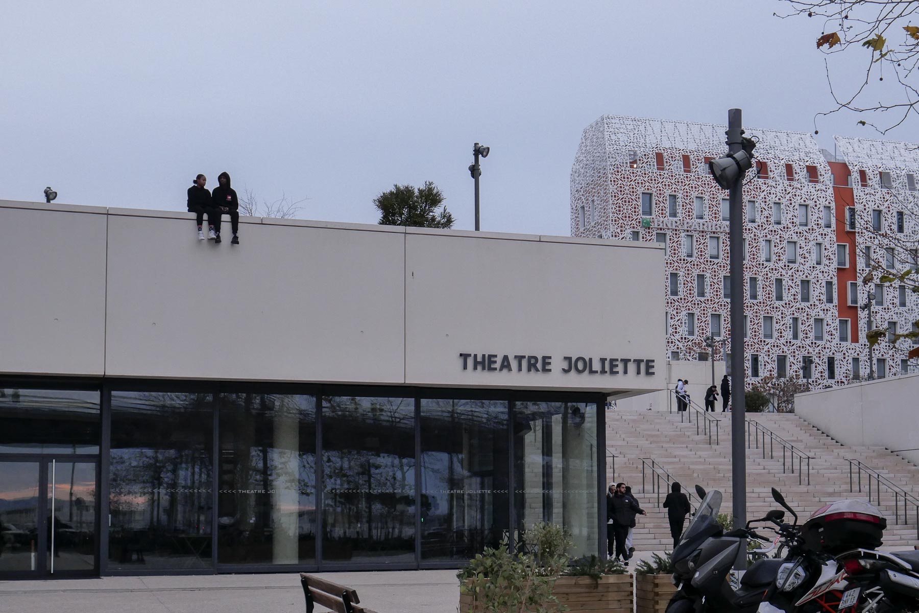 Midi et des poussières, je bois un café en terrasse, au soleil, face à l’imposante église Sainte-Marie Madeleine des Chartreux dans le quatrième arrondissement de Marseille. Le contraste puissant, l’imposante taille des colonnes ioniques (plus de dix mètres de haut !) et l’arrivée des trottinettes me font sortir l’appareil photo de mon sac.