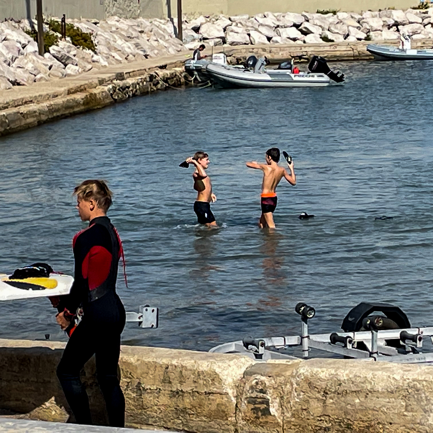 Un samedi midi d’octobre, je patiente aux abords de la plage. Je tue le temps en observant deux gamins qui se poursuivent dans l’eau en riant aux éclats. Je me dis, entendant les impacts des tongs, que d’un moment à l’autre le jeu va dégénérer en bagarre véritable. J’ai tort. Ils sortent de l’eau tranquillement au bout d’un moment. Comme quoi…