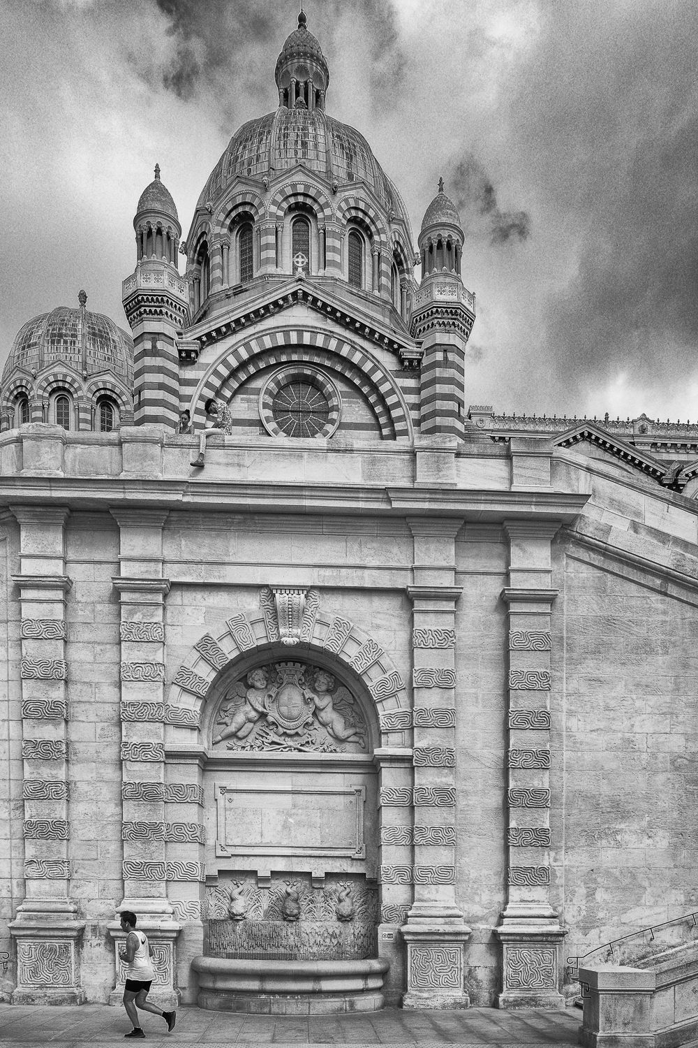 Je descends le grand escalier devant la Major après être passé près du jeune couple en haut de l’image. Ils n’ont pas bougé, toujours en grande discussion. J’attends qu’il se passe quelque chose en bas pour déclencher.