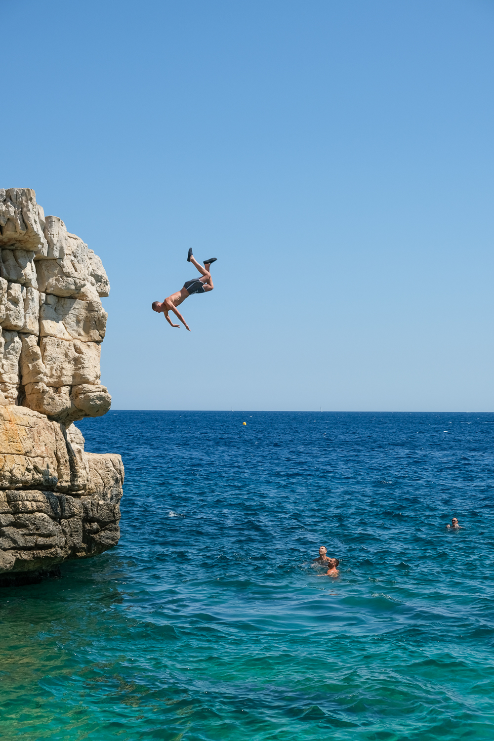 Un dimanche à Cassis. De la terrasse d’un des restaurants de la presqu’île, on peut admirer les jeunes qui font des sauts du haut de la falaise. Je vous rassure, malgré les apparences, il est tombé tout droit les pieds dans l’eau.
