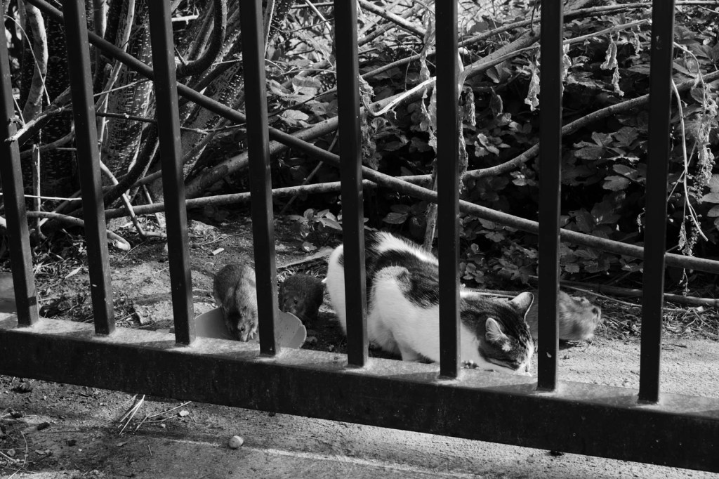 En bas du parking, près de l’entrée du parc, un portail toujours fermé qui donne sur des broussailles. C’est là qu’un papi et une mamie nourrissent les chat errants du quartier. J’arrive au moment où ce matou affamé, à la patte avant abimée, se jette sur sa pitance. Dès le départ du couple, trois rats rappliquent du buisson et se précipitent sur la gamelle inoccupée en me surveillant du coin de l’œil. Au moindre geste, ils fuient vers l’arrière, mais ils n’ont aucune crainte du chat qui les ignore. L’un des rats ira même grappiller dans l’assiette du minet.