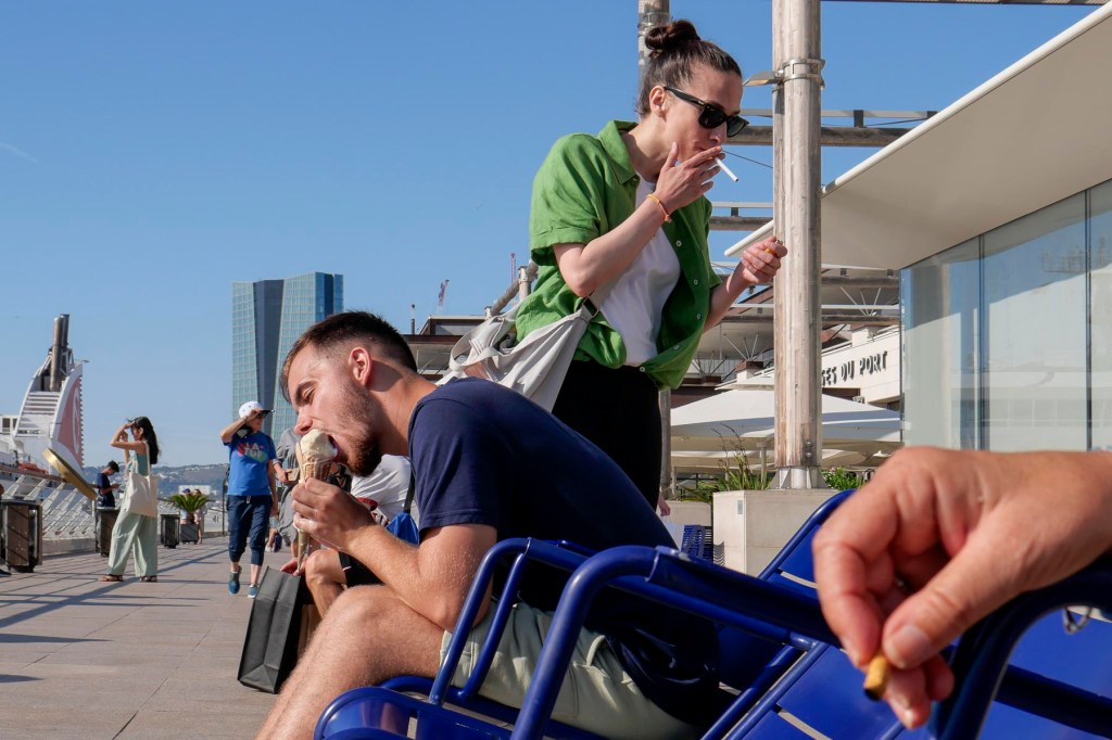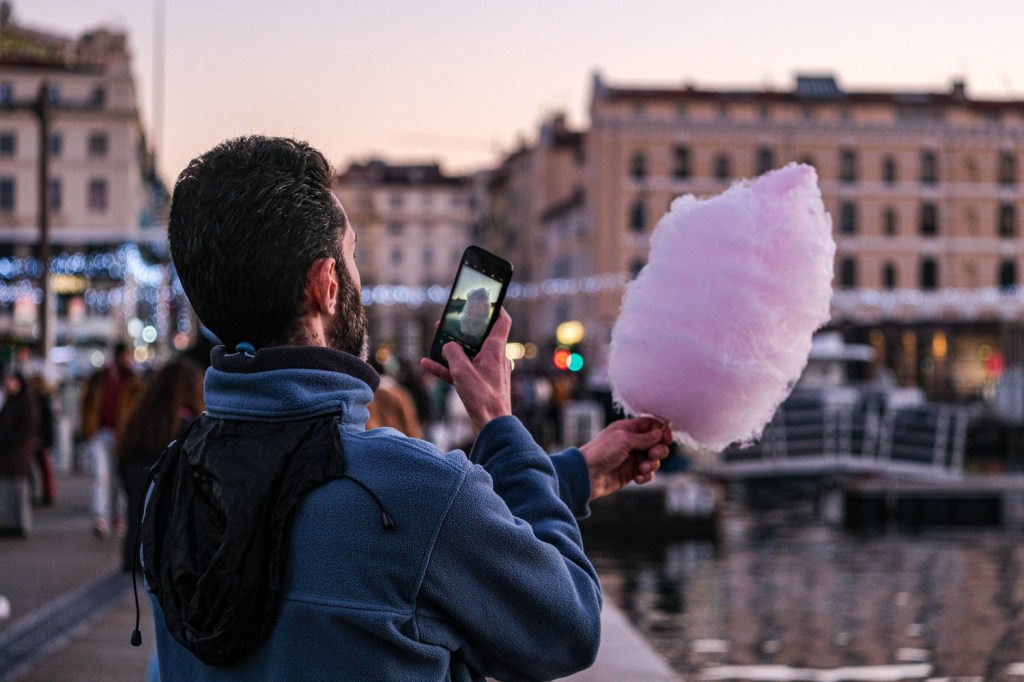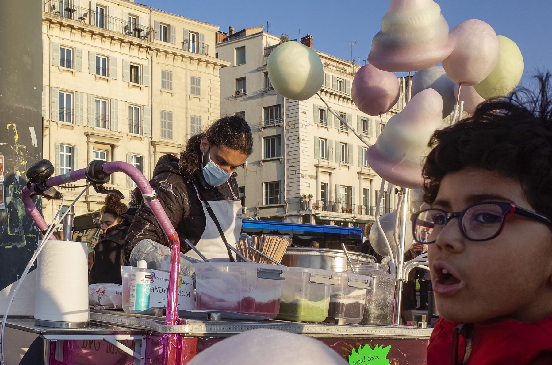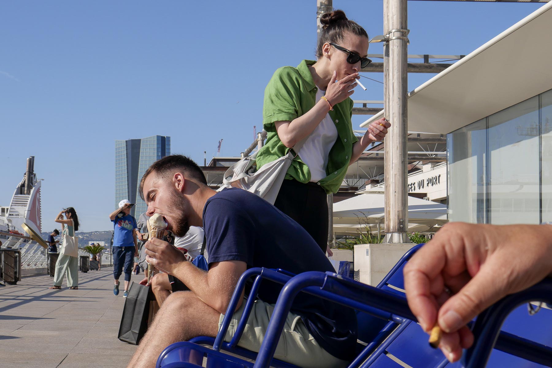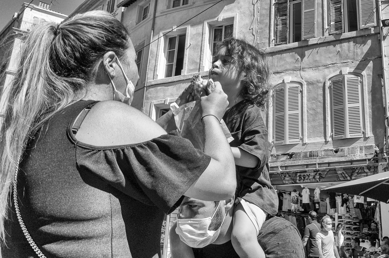 Je les vois de loin. Le couple marche tranquillement, le gamin sur les épaules du père. Au moment où je les croise, le gosse ouvre des grands yeux en découvrant sa mère qui mange une viennoiserie. Il se penche d’un coup vers elle, aidé par le père (sous le coude de madame sur l’image), qui plie les genoux. Et la maman fait le nécessaire. Des gentils parents.