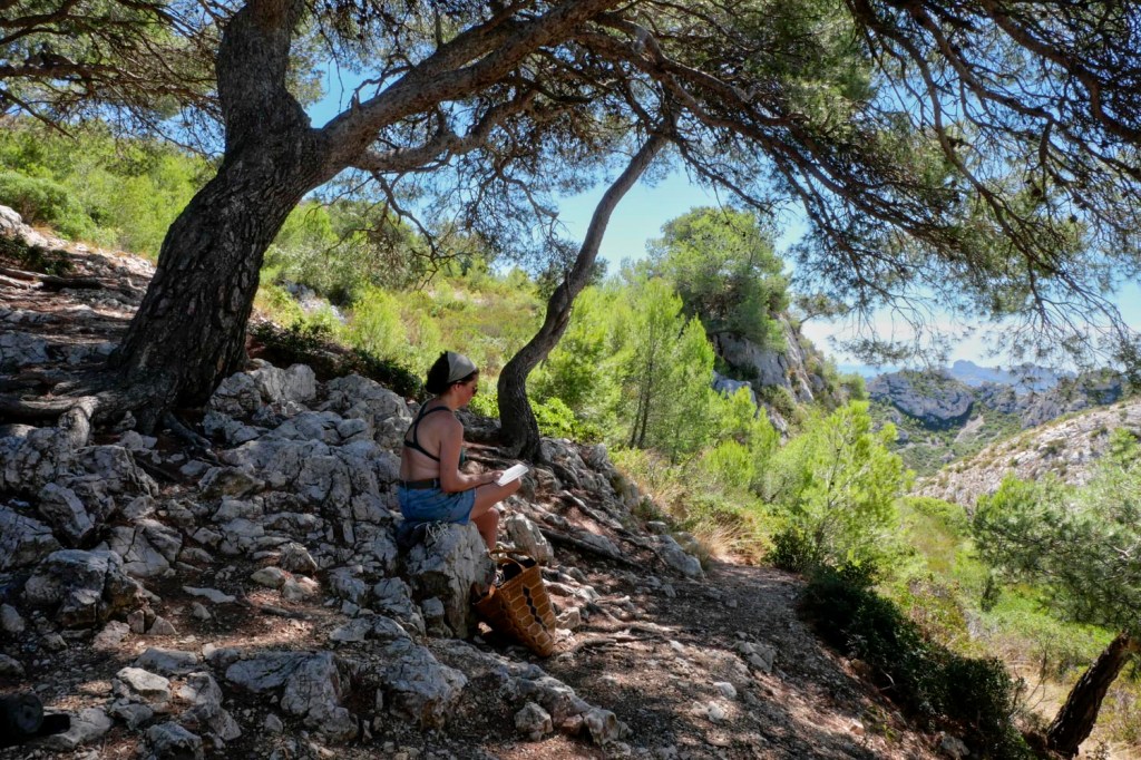 Dernier jour du mois d’août, sortie VTT dans le massif des calanques. Le temps est au beau fixe, les pins embaument l’atmosphère, l’été est encore costaud. Pause déjeuner à l’ombre des pins au-dessus de la calanque de Sormiou dans un paysage splendide.