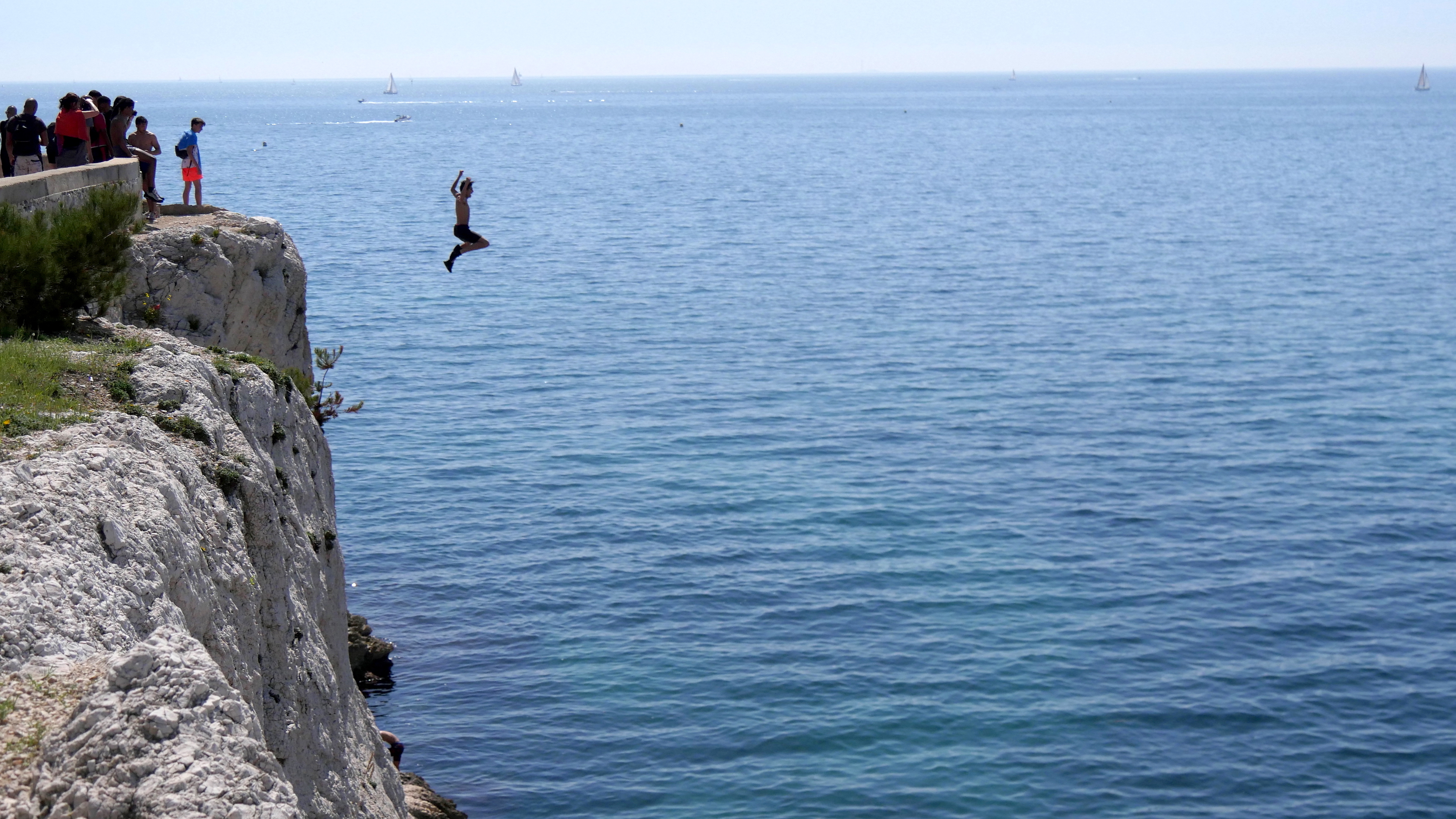 Si vous avez lu Corniche Kennedy, cette photo doit vous rappeler ce roman dans lequel Maylis de Kerangal évoque un groupe d’adolescents qui joue à se faire peur en sautant dans la mer du haut des rochers de la Corniche. Ils commencent par des sauts faciles puis grimpent plus haut pour des sauts de plus en plus dangereux. Une parfaite illustration, samedi dernier.