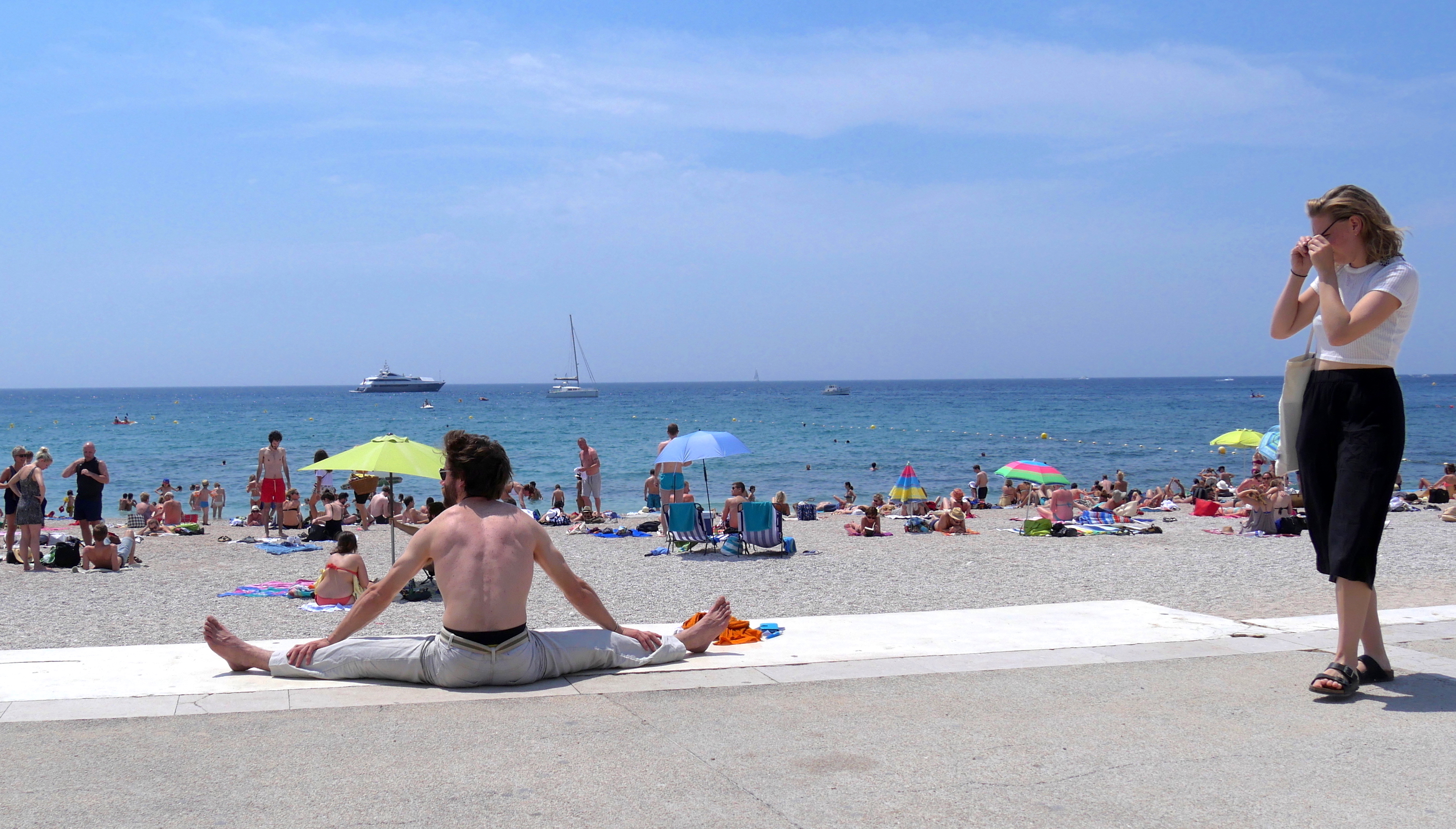 Plage de Cassis en plein été. Après avoir fait un équilibre sur les mains, le jeune homme fait des mouvements de gymnastique sophistiqués dans l’indifférence générale à deux exceptions près : la jeune femme à droite et moi.