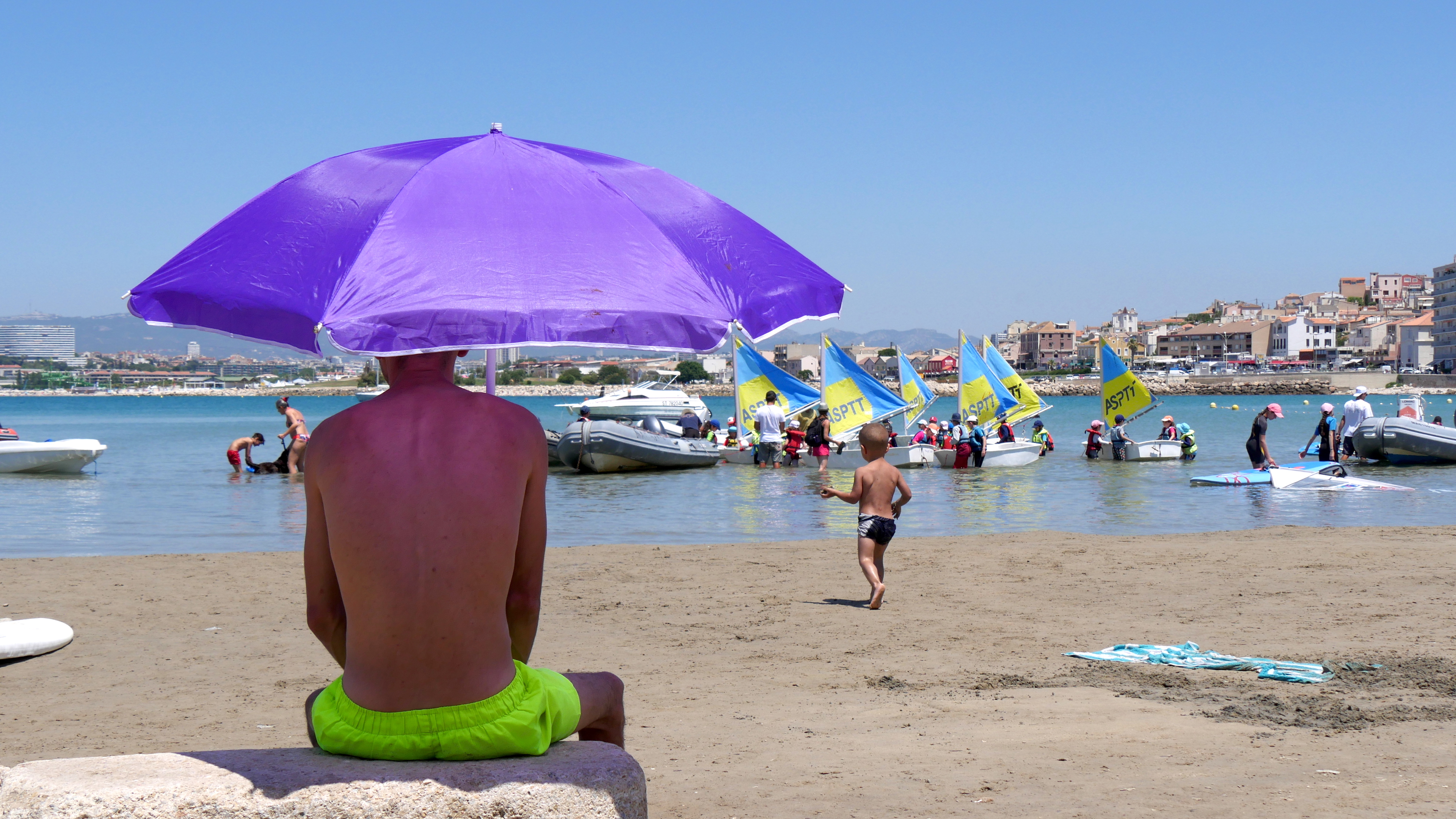 Trois solutions pour se protéger du soleil sur la plage de la Pointe Rouge : la baignade (le fiston), le parasol (le papa), le bistrot ombragé dans mon dos (j’y vais de ce pas).