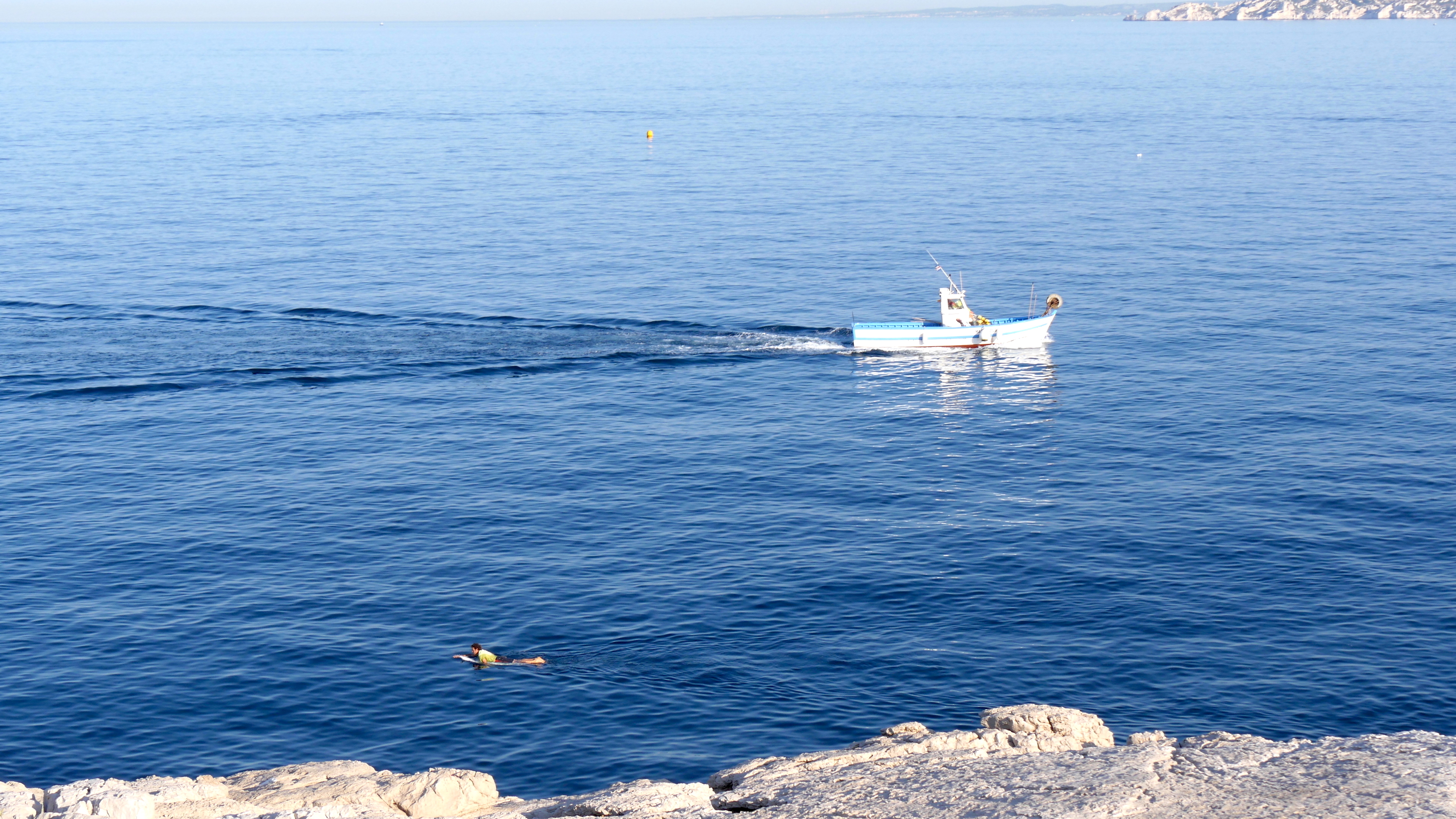 Un dimanche matin dans la calanque de Samena. Assis sur les rochers, j’admire le paysage quand j’entends arriver ce petit bateau du port des Goudes. Et je découvre le solitaire qui va dans l’autre sens, seul, tranquille, à plat ventre sur sa petite planche.