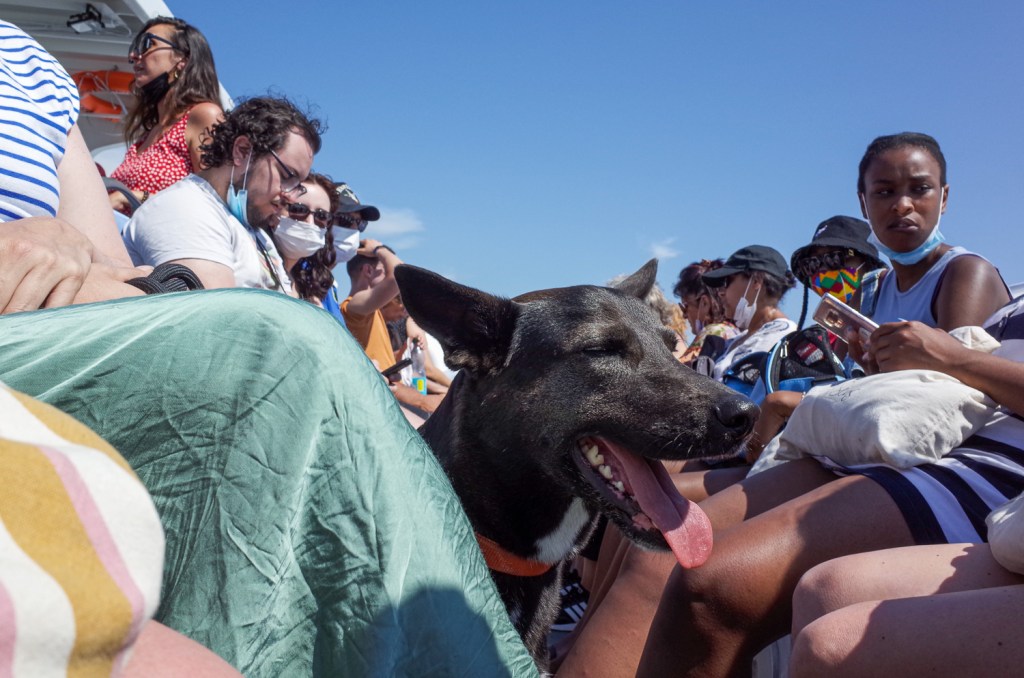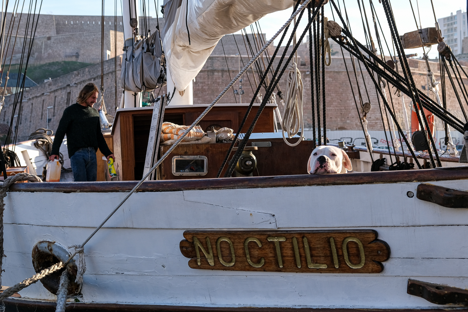 Au pied du Mucem mouille un superbe voilier en bois, à moins qu’il ait jeté l’ancre ou simplement stationne. Rayez les mentions inutiles. Sur le pont veille un chien impassible. Assis face à lui sur une bitte d’amarrage, je fais des petits bruits pour qu’il regarde dans ma direction. Il ne bouge pas d’un poil, les babines posées sur le bastingage.