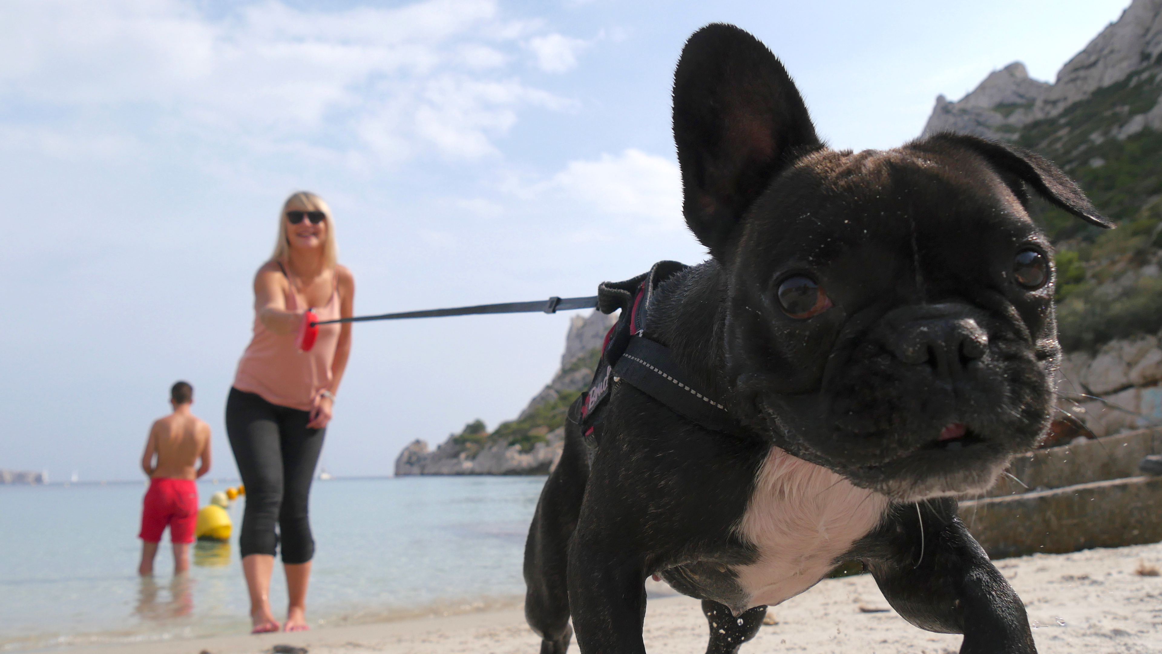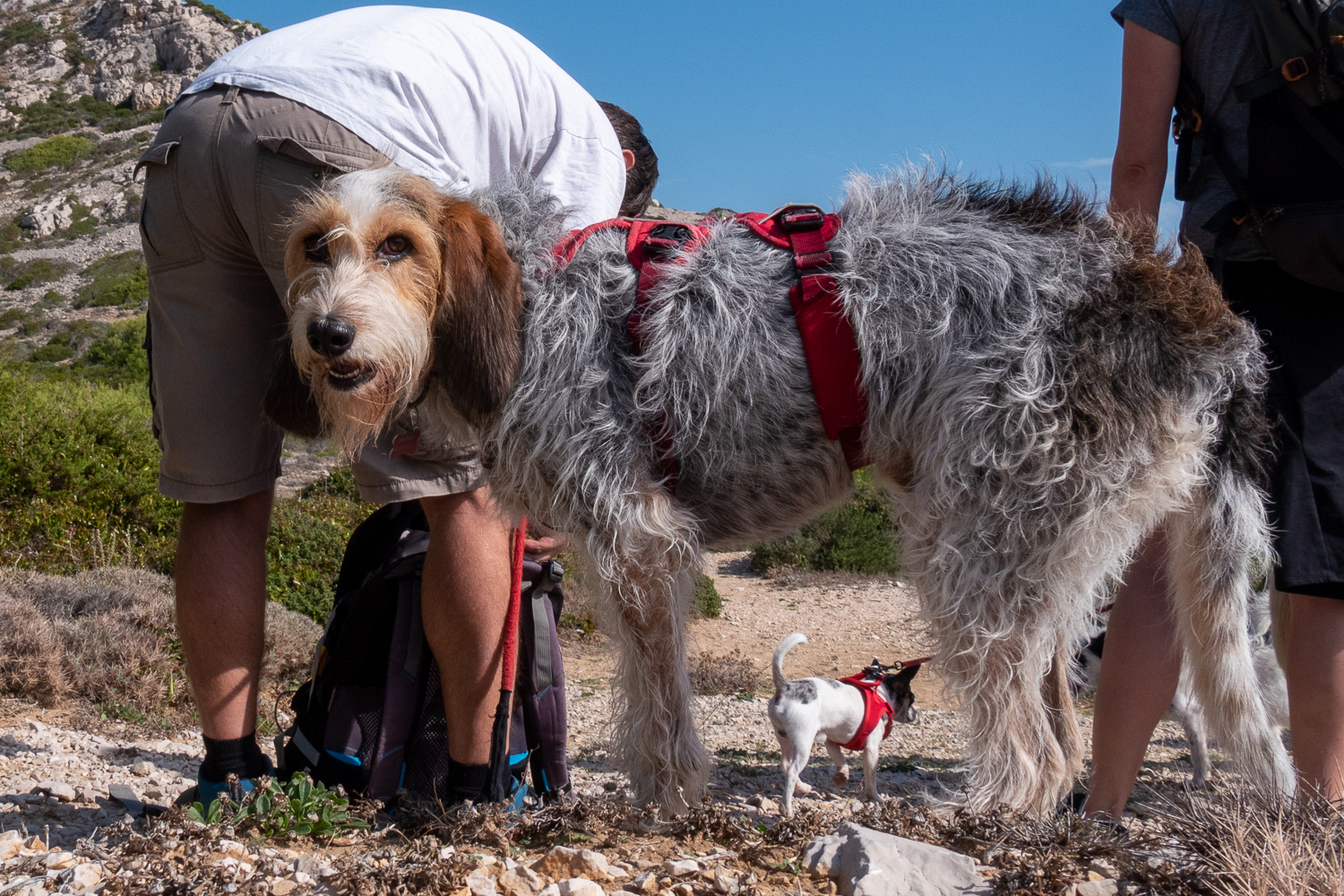 Quand je croise ces randonneurs à l’arrivée dans la calanque de Marseilleveyre, je me retourne doucement pour photographier le chien qui devine (sent ?) ma présence. Il tourne la tête et me jette ce regard. Je m’attendais à ce qu’il aboie. Rien, juste ce coup d’œil presque humain (en gros plan c’est manifeste). Le petit chien entre ses pattes ne m’a pas calculé (j’adore cette expression).