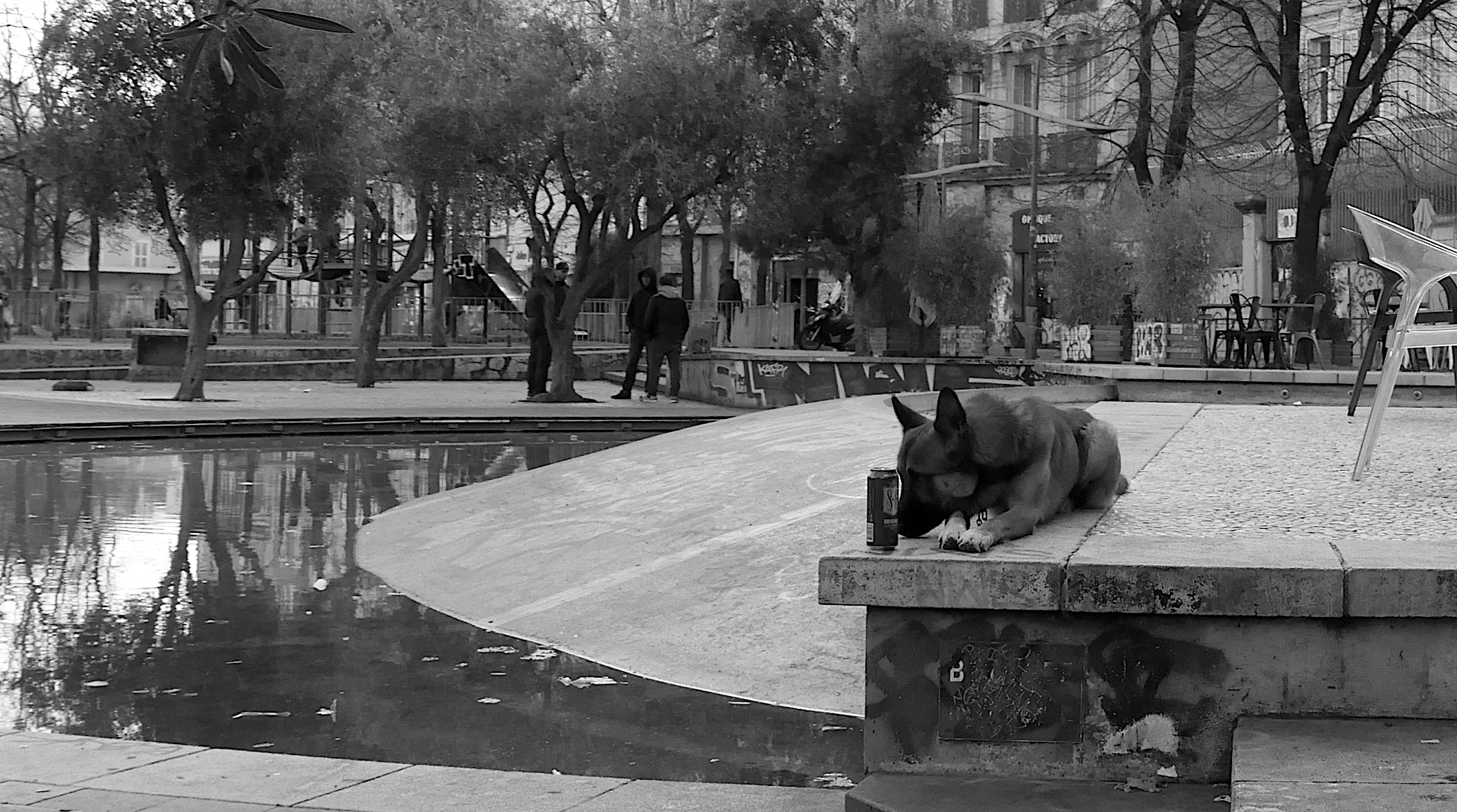 Lumière blafarde de fin d’après-midi d’hiver quand je traverse le cours Julien en direction de la désormais tristement célèbre rue d’Aubagne. Sur le cours, je croise ce chien veillant de très près sur la canette de son maître. Le haut de la rue d’Aubagne est toujours inaccessible aux piétons et véhicules.