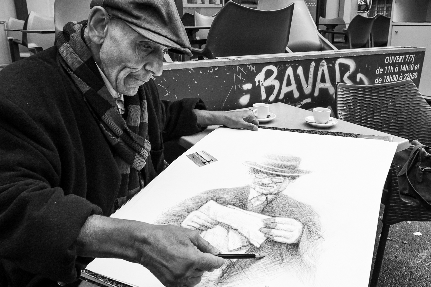 Assis à une terrasse de bistrot des Cinq Avenues, il dessine. Je m’arrête pour regarder son ouvrage. Il entame aussitôt la conversation, me montre ses dessins au crayon qui représentent tous des personnages. Je lui offre un café. Il accepte. Je m’assois et je lui demande si je peux le prendre en photo. On discute dessin, peinture, photo.