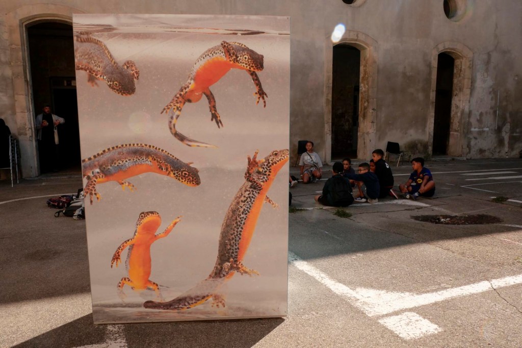 Exposition La touriste de Kourtney Roy dans les étages de l’ancien collège Mistral, un grand bâtiment qui mériterait une petite rénovation. Au rez-de-chaussée, dans la cour, parmi les visiteurs beaucoup de groupes d’enfants sages.