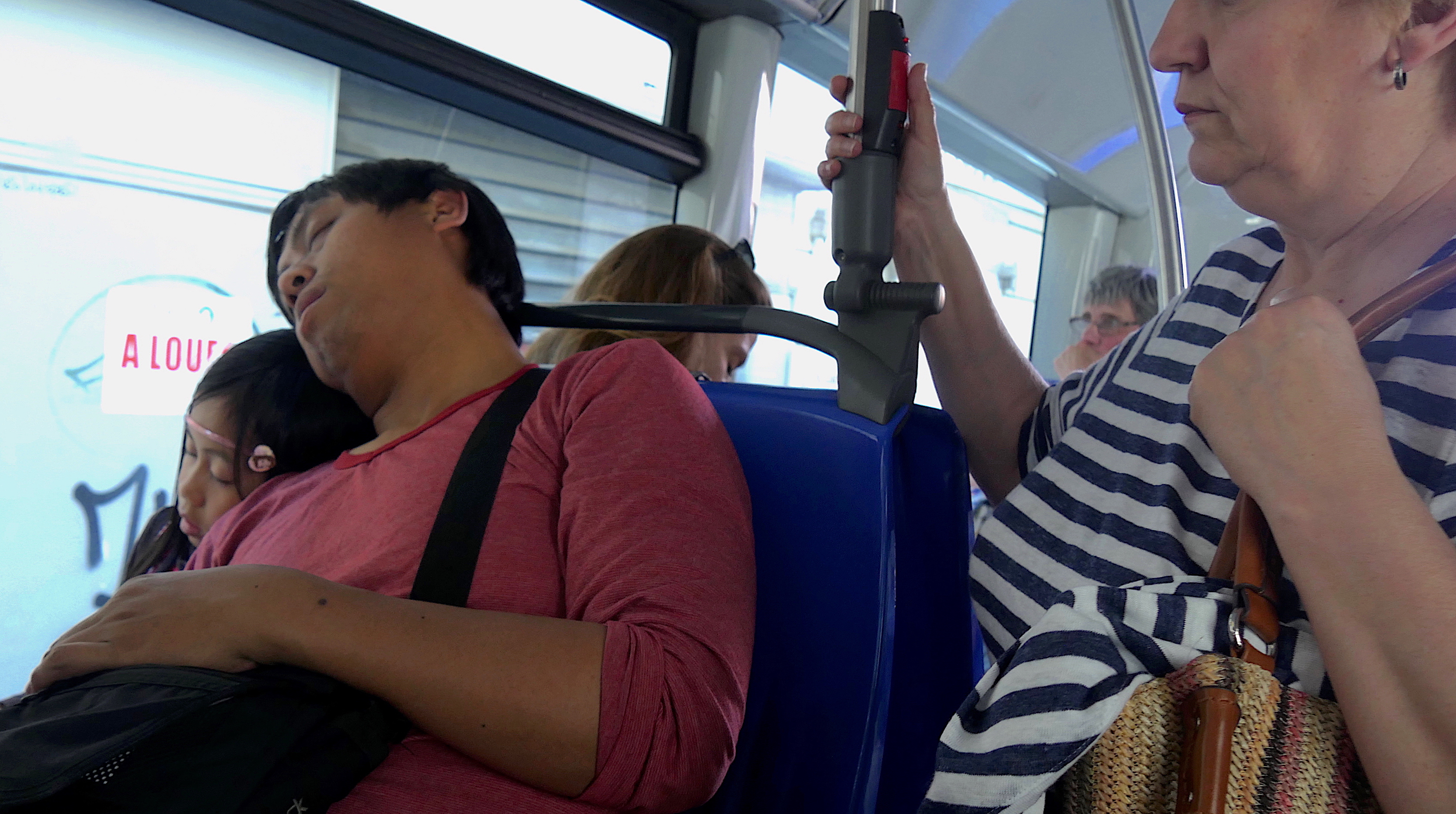 Dans le 57 en direction de la maison. Bientôt 17 h et il fait encore chaud. Quand je monte dans le bus, l’homme au tee-shirt est déjà endormi. Sa fille au bandeau rose l’a suivi quelques arrêts plus tard.