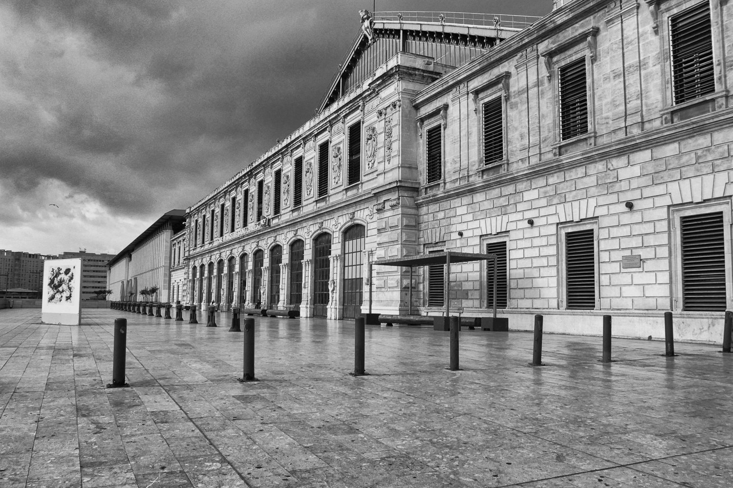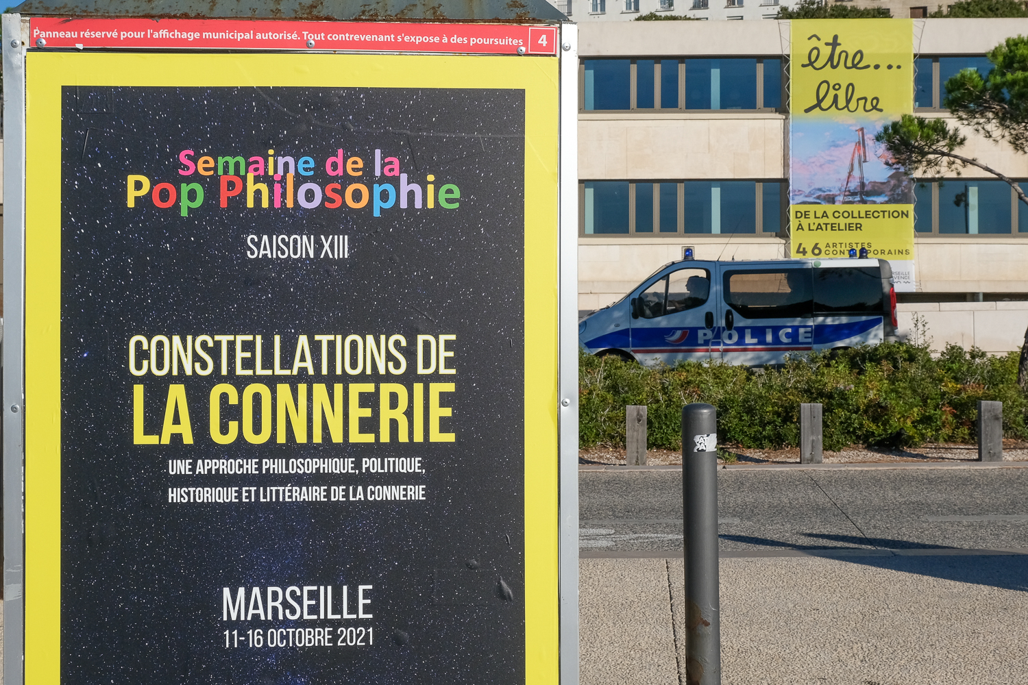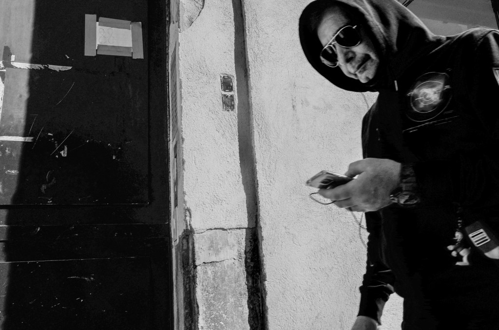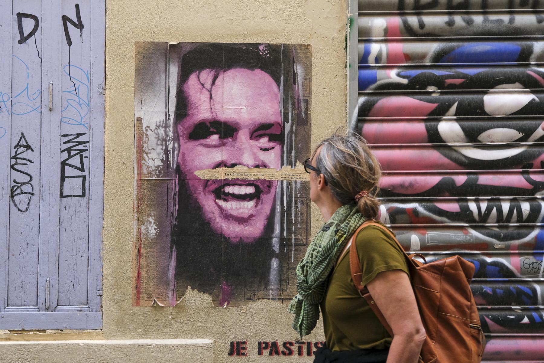 Quand je passe devant ce photogramme revisité de Shining (Jack Torrance, alias Nicholson vient de détruire à la hache la porte de la salle de bain où s’est réfugiée son épouse), je me poste contre le mur bien en face de l’image. Je devrais dire : je m’incruste dans le mur pour disparaître aux yeux des passant(e)s. La ruelle est étroite, mais ça marche plutôt bien : on m’ignore et si quelques-un(e)s sont passé(e)s sans un regard pour Jack, une majorité a jeté un coup d’œil à l’inquiétant bonhomme.