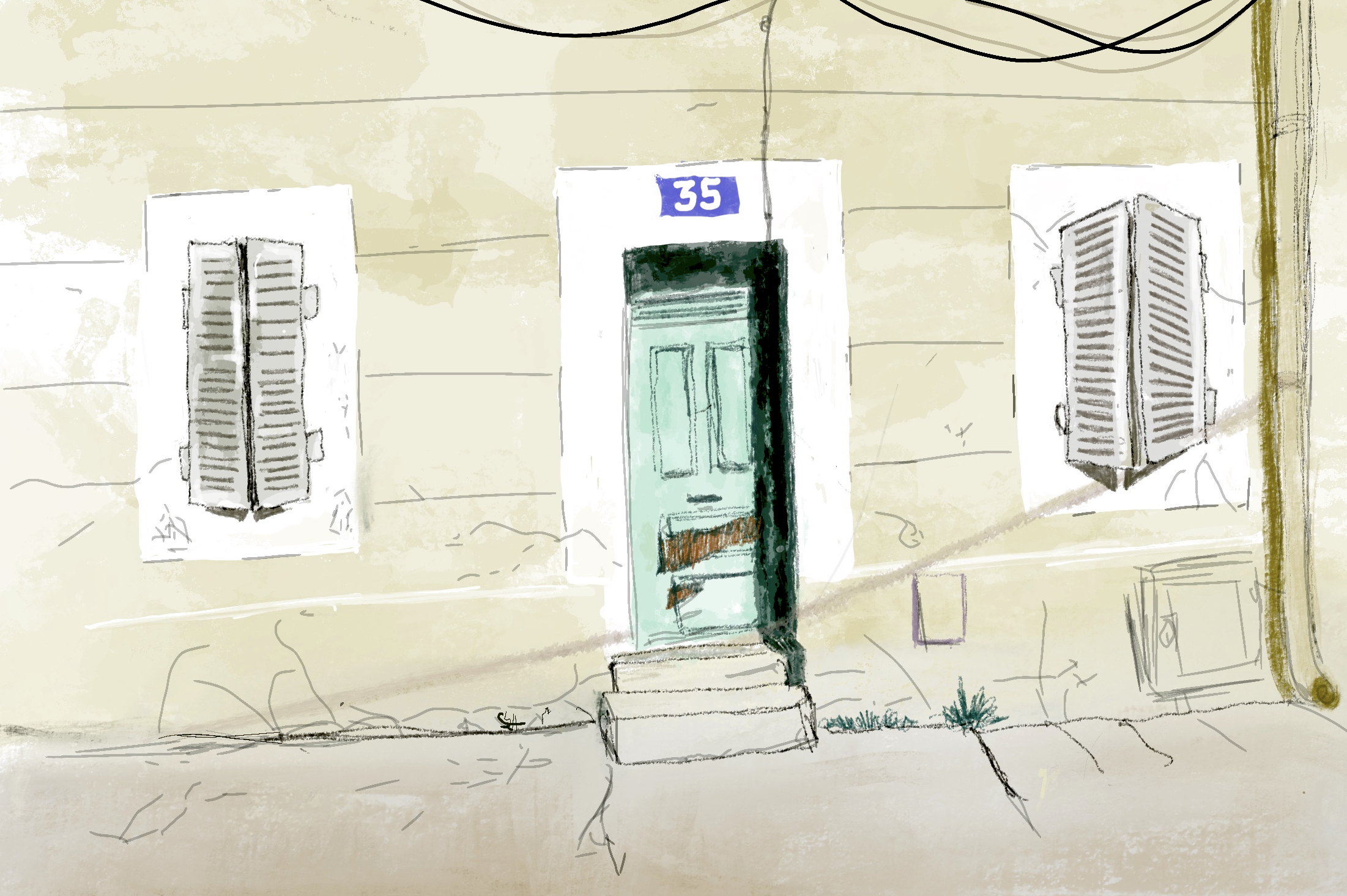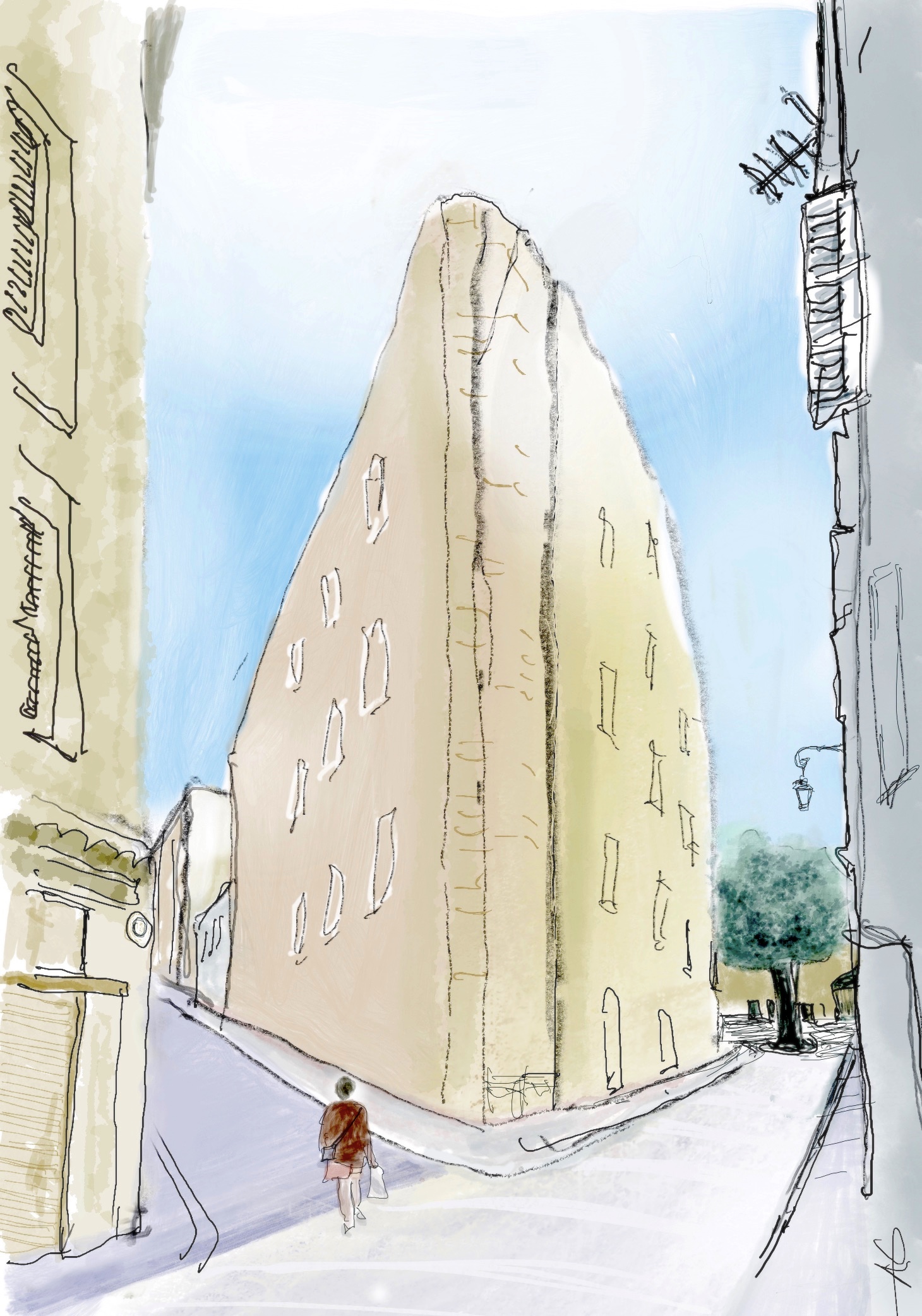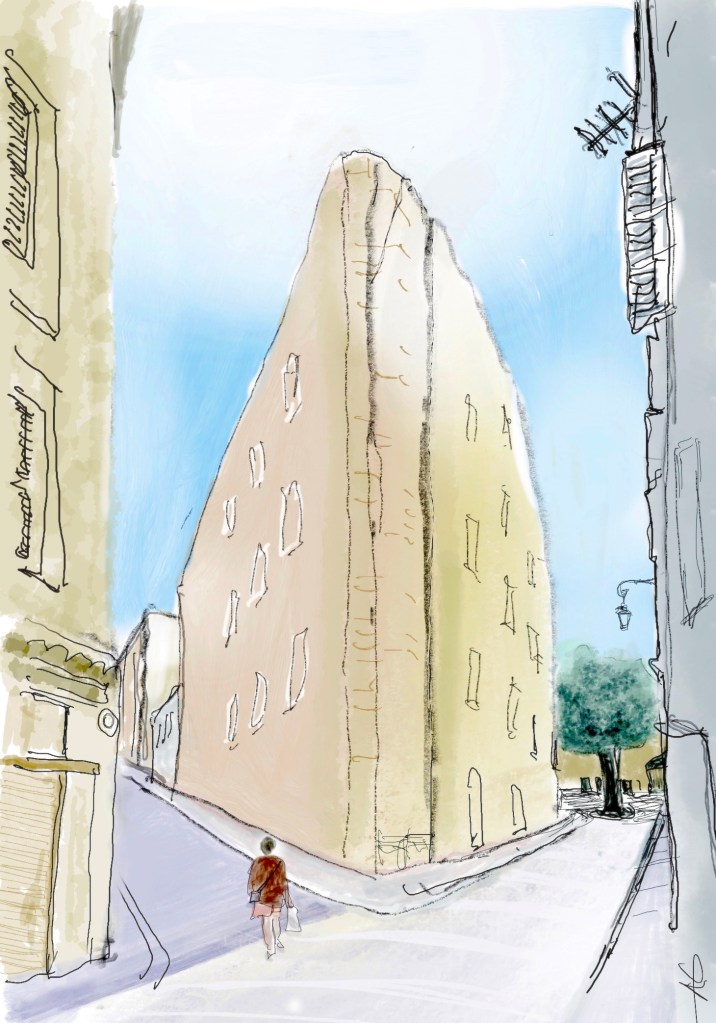 En haut des escaliers du Passage de Lorette (https://wordpress.com/post/alaingirard.net/7868) j’avance, le souffle court, dans la rue éponyme. Ce vieil immeuble, qui fait le coin avec la rue Guintrand, me fait de l’œil. Je le photographie mais la photo ne me plaît pas… Je préfère le dessin même si, dans la réalité, le bâtiment est moins décati.