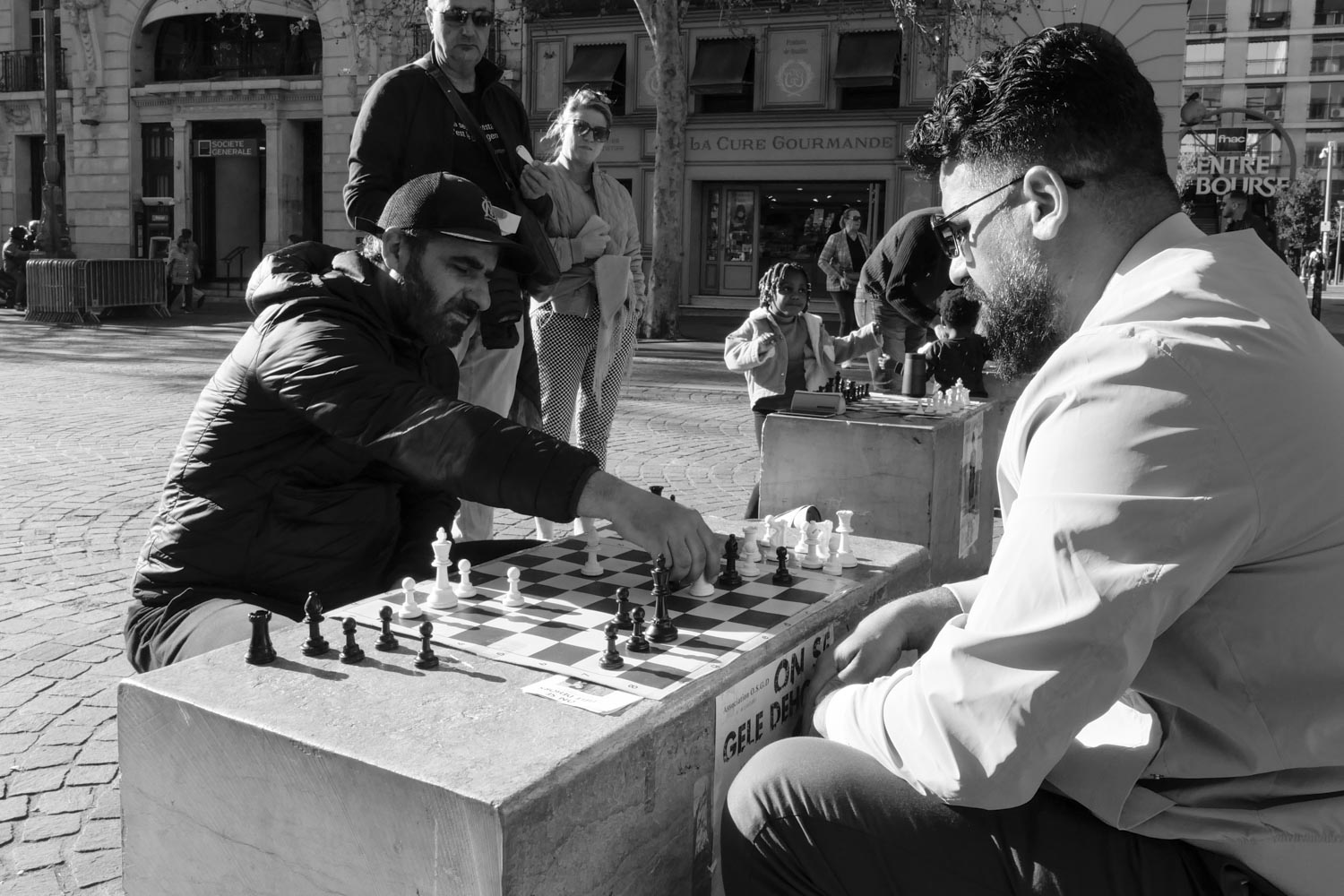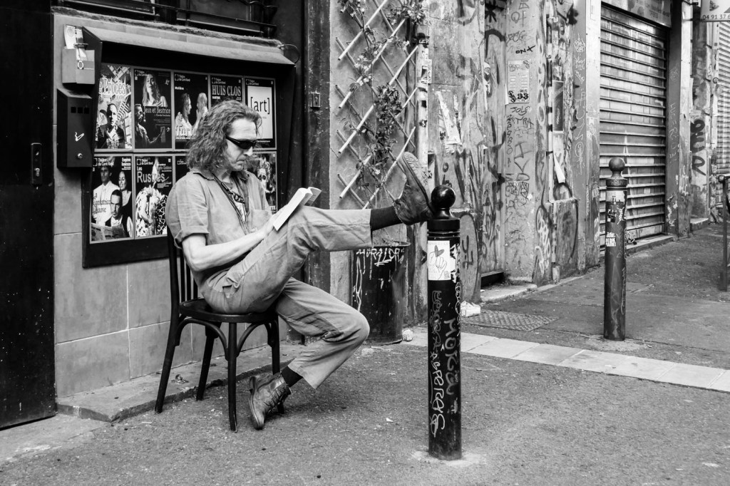 Plus exactement : rue André Pogiolli. Je suis passé dans un sens en direction de la Plaine et je suis revenu par cette même rue environ une heure trente plus tard. Je l’ai photographié à l’aller et au retour. Il n’a pas changé de jambe, juste un peu modifié sa position. Je n’ai pas réussi à voir le titre du passionnant bouquin dans lequel il est plongé.