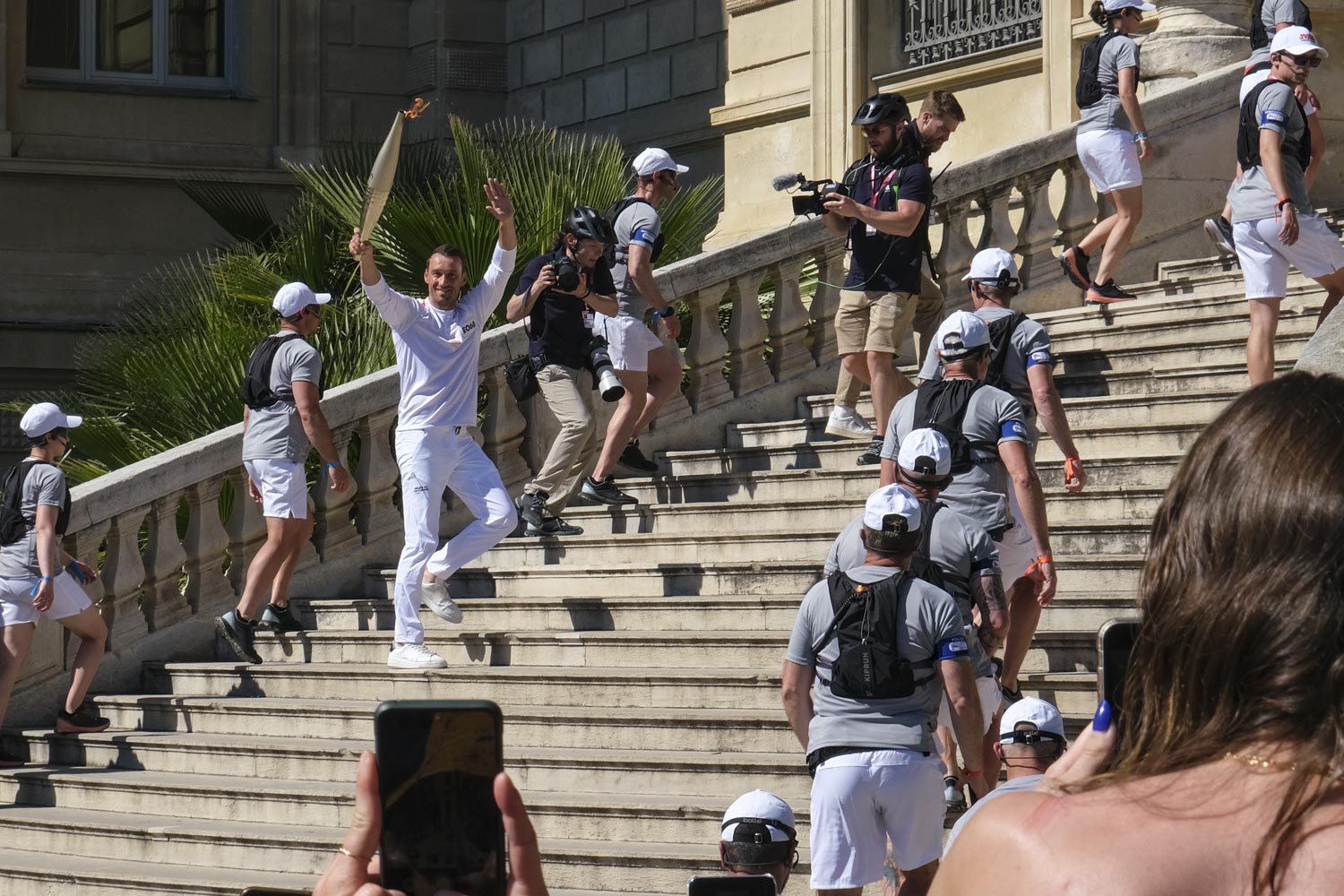 Pour en finir avec la flamme olympique. Comme je n’ai pas eu la patience de faire la queue pour entrer au Vieux Port, le lendemain je me poste au pied des escaliers qui montent au Palais Longchamp. Je vois enfin la flamme de près. Elle est bien entourée.