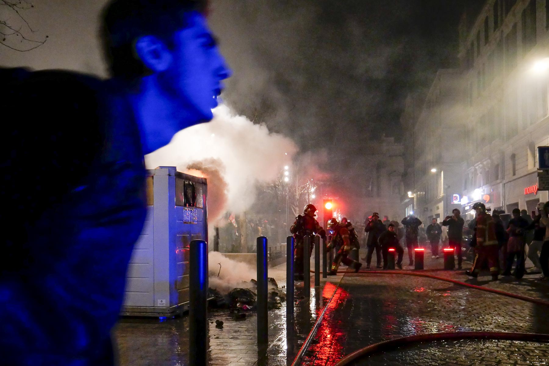 Quand un rassemblement devant la préfecture se transforme en manifestation de rue, la colère monte, le container flambe, les pompiers interviennent et leur gyrophare peint un homme en bleu.